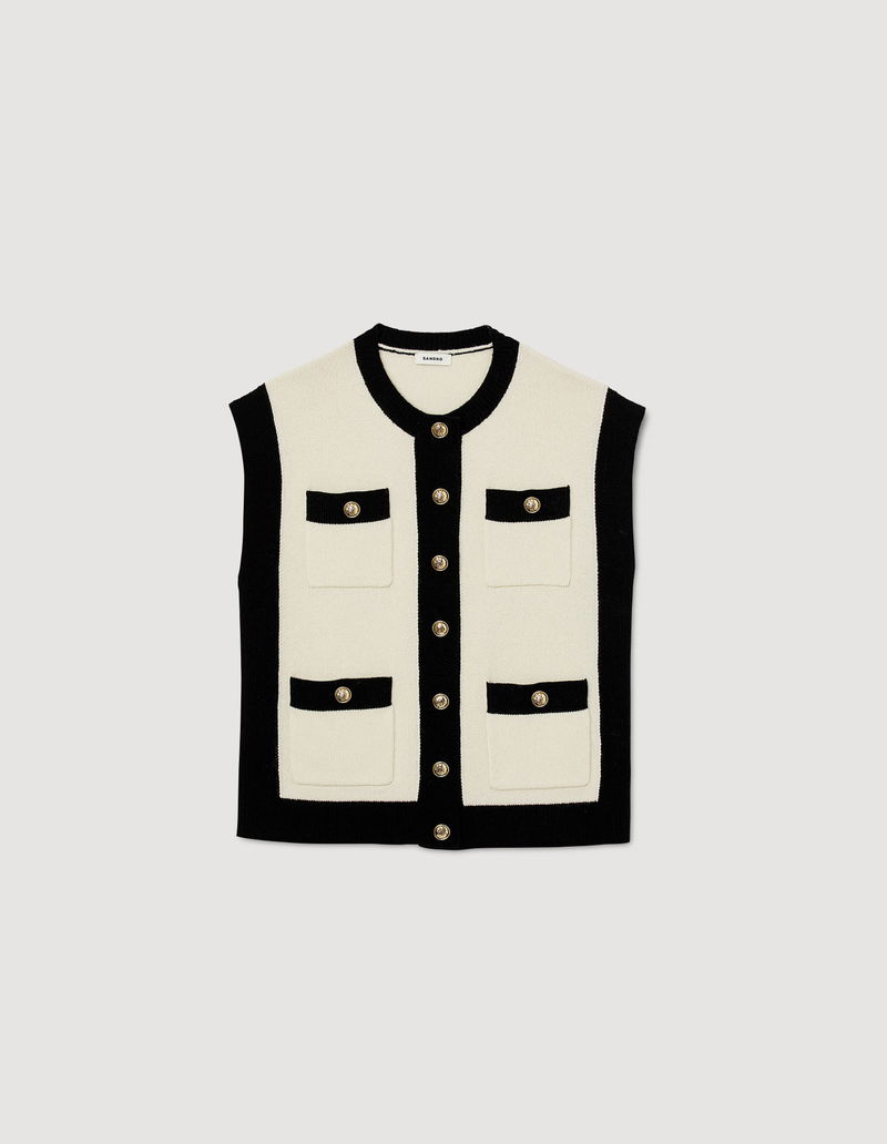 Two-tone sleeveless coatigan with a round neck, patch pockets and a gold button fastening.