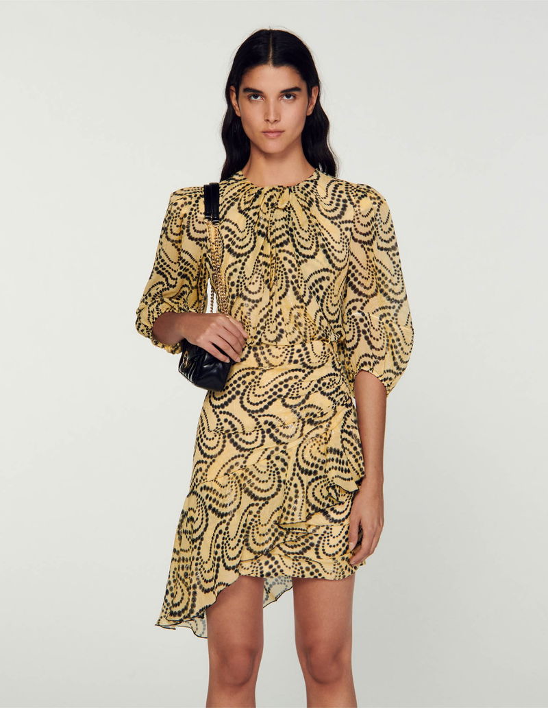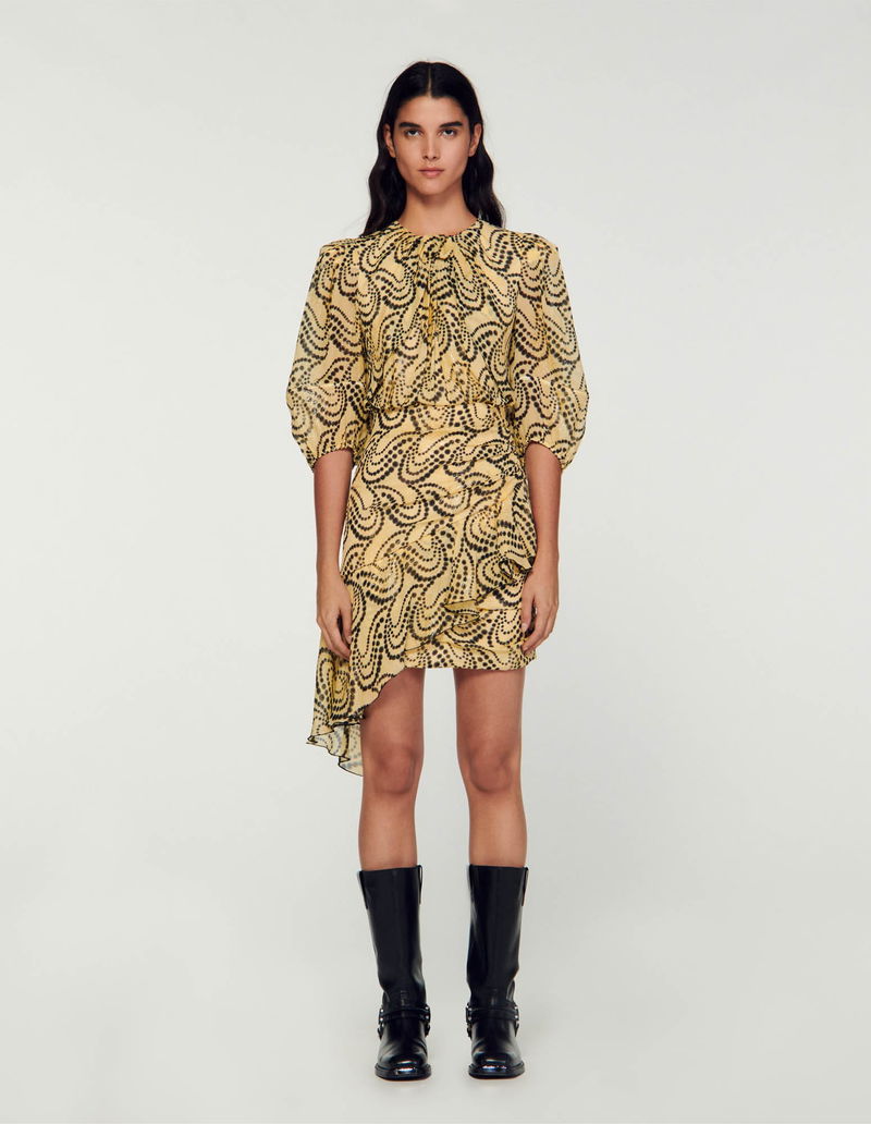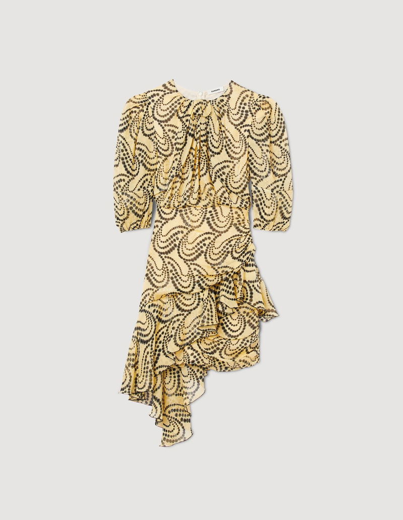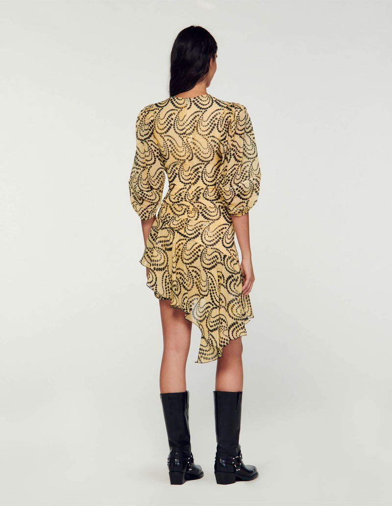 Draped and twisted round-neck dress featuring baggy three-quarter-length sleeves, an asymmetric ruffled skirt and embellished with a paisley pattern.