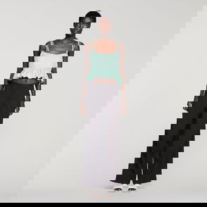 Sleeveless rib knit jumper with round neck and contrasting ruffles at the bottom.