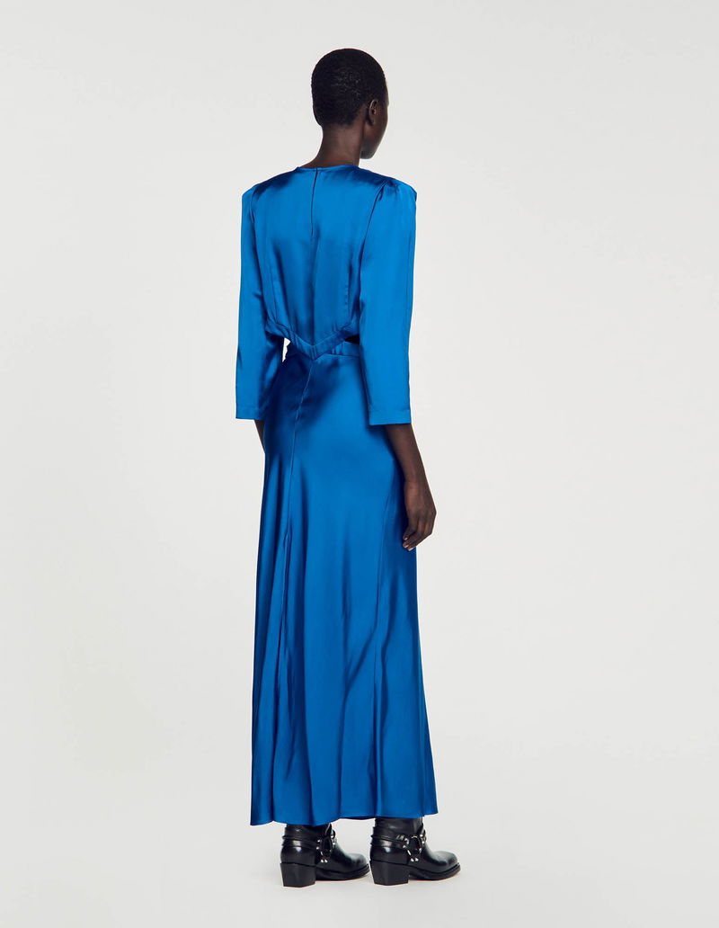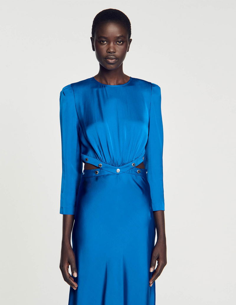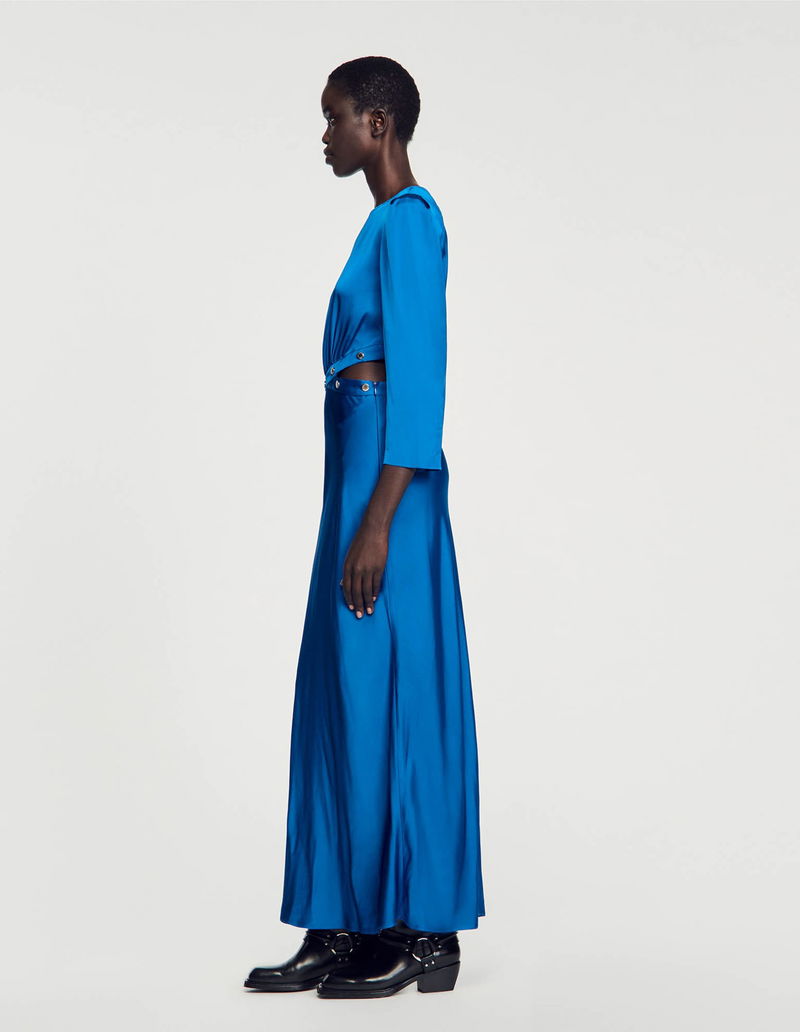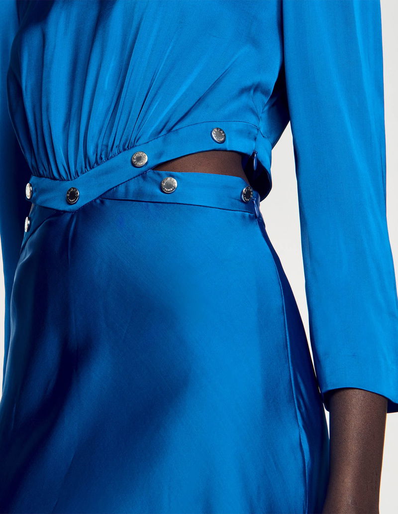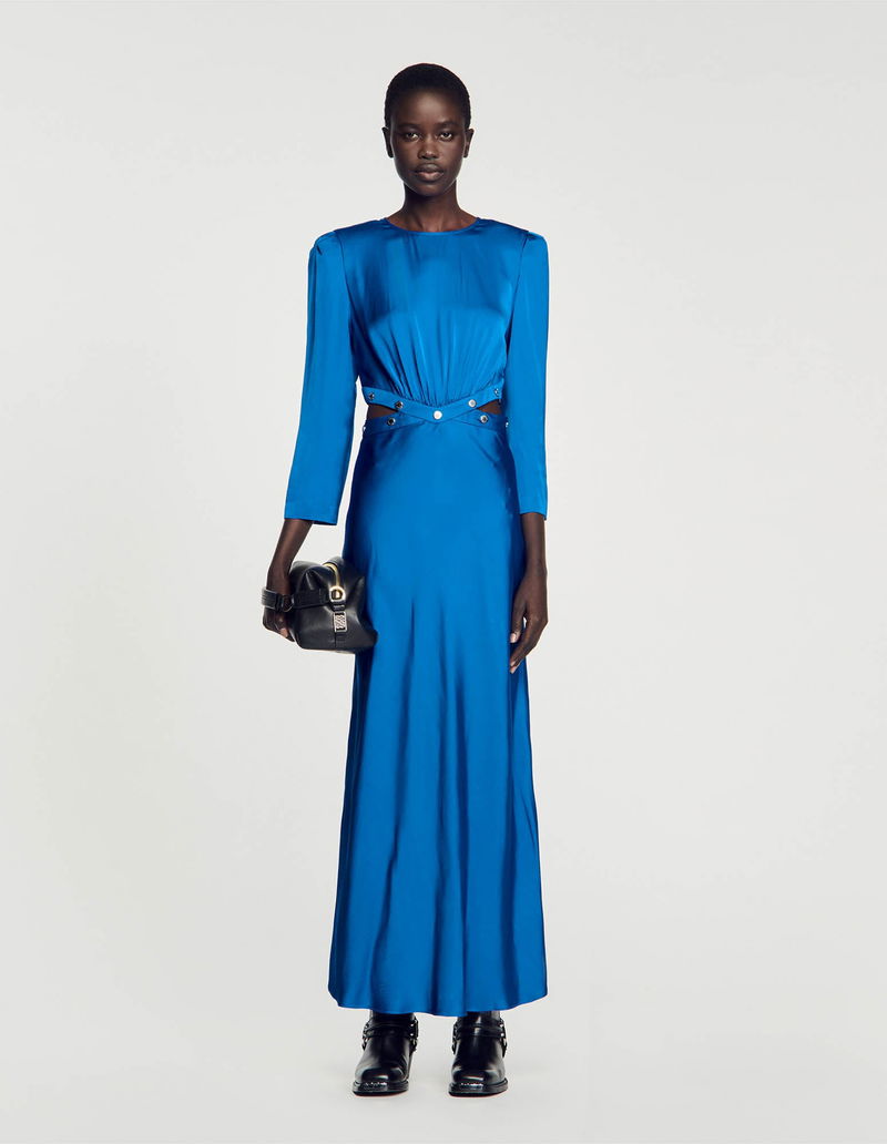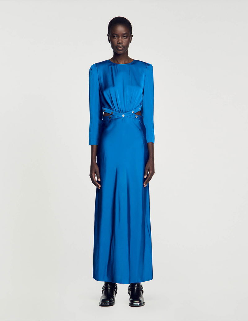 Satin-finish maxi dress with shoulder details, a round neck, long sleeves and openwork cut-outs at the waist decorated with silver-coloured branded buttons.