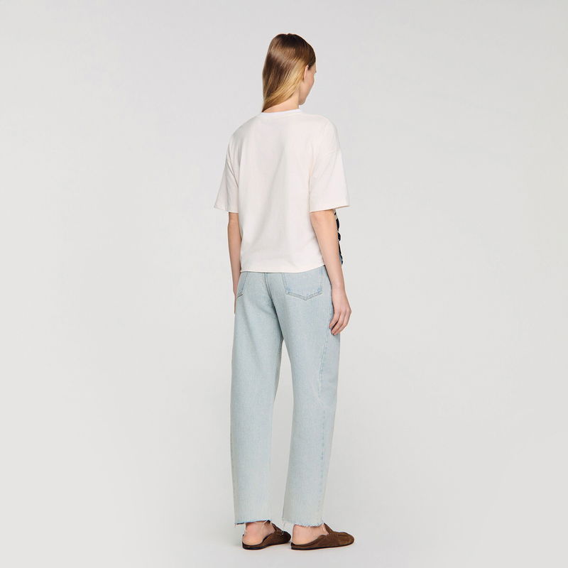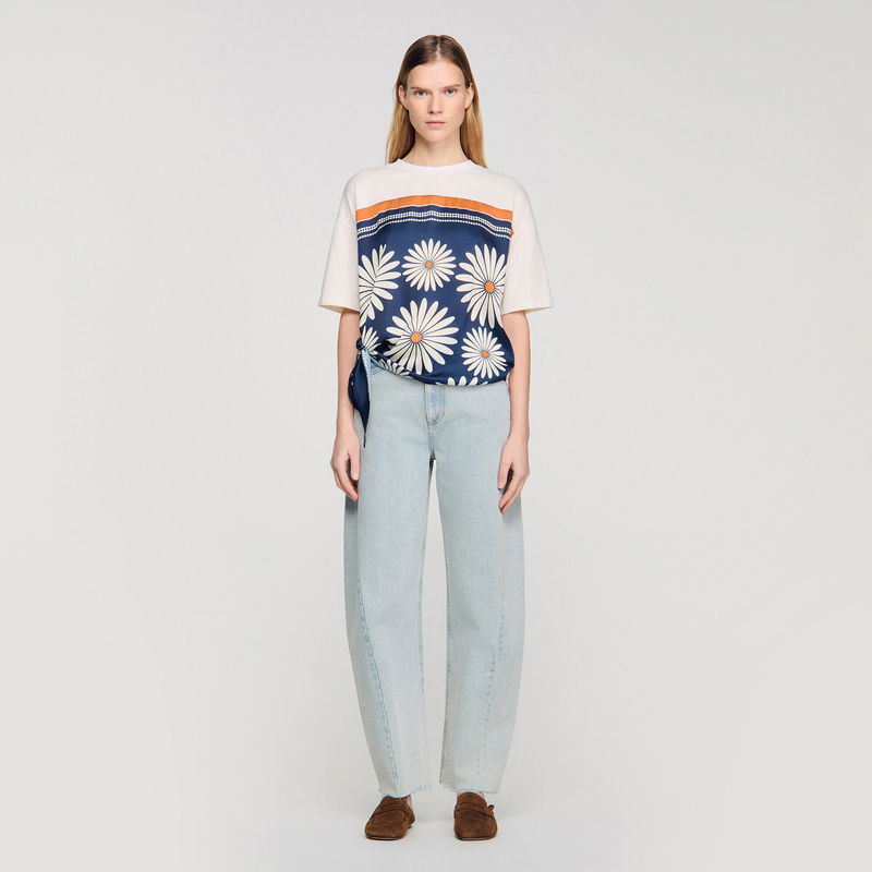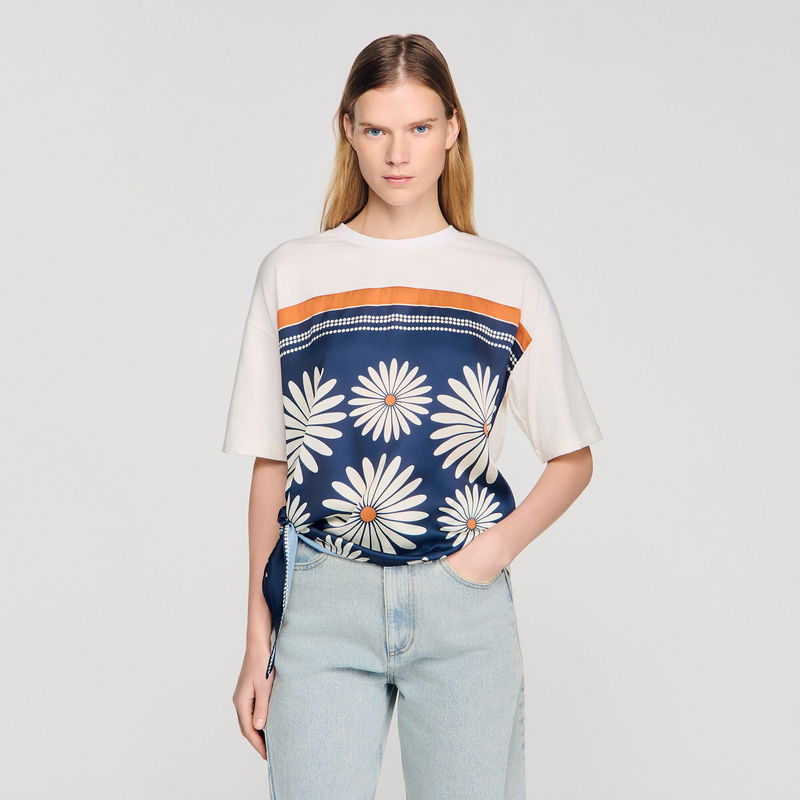 Cotton T-shirt with round neck and short sleeves, embellished with a bandana-print halterneck panel that ties at the side.