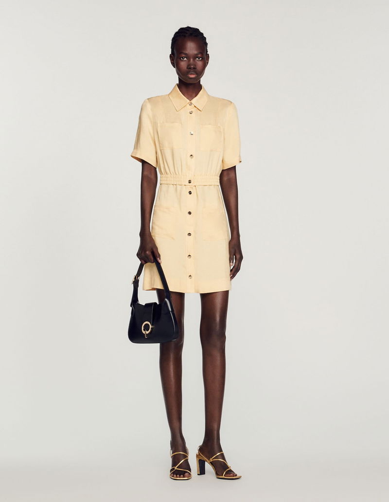 Short buttoned dress with a shirt collar, short sleeves and an elasticated waist.