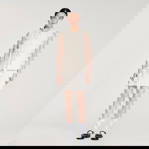 Short openwork dress with round buttoned neck, short sleeves and scalloped hems.