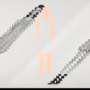 Short sleeveless tweed dress with round neckline, button fastening and patch pockets with flaps.