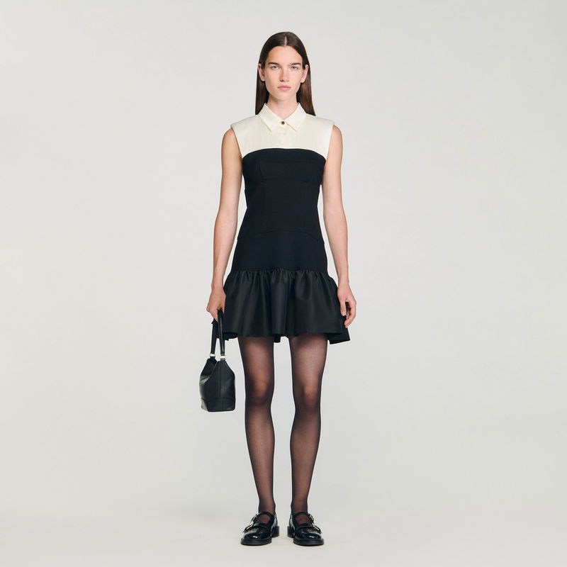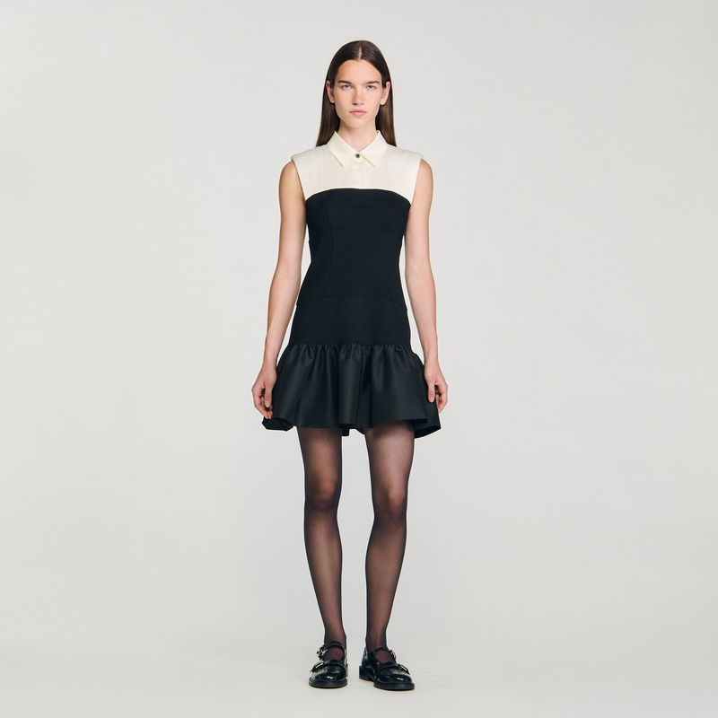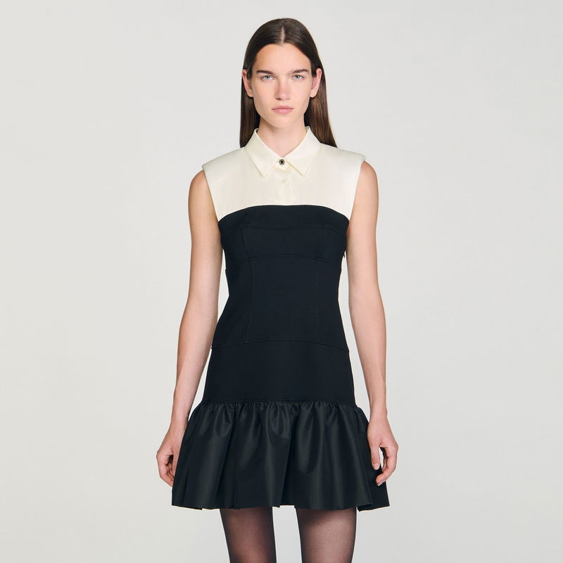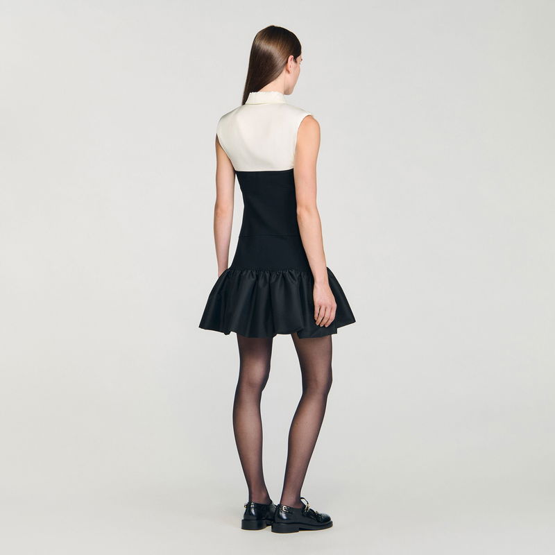 2-in-1 short dress with satin top, corset-effect fitted waist and taffeta-effect ruffled skirt, featuring a shirt collar and side zip fastening.