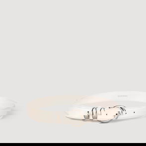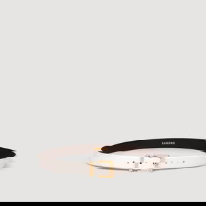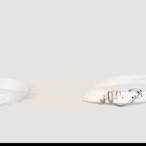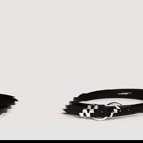 Slim leather belt with decorative metal buckle.