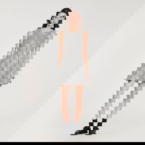 Short sleeveless tweed dress with a button placket featuring pearl-bead buttons and a contrasting ruffle at the bottom of the skirt.