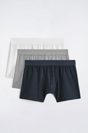 These classic style men's boxer shorts are made with soft stretch cotton and feature a mid-rise contrast elastic waistband. Contains three pairs.