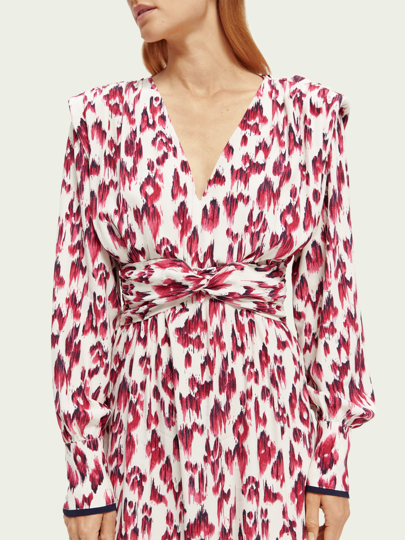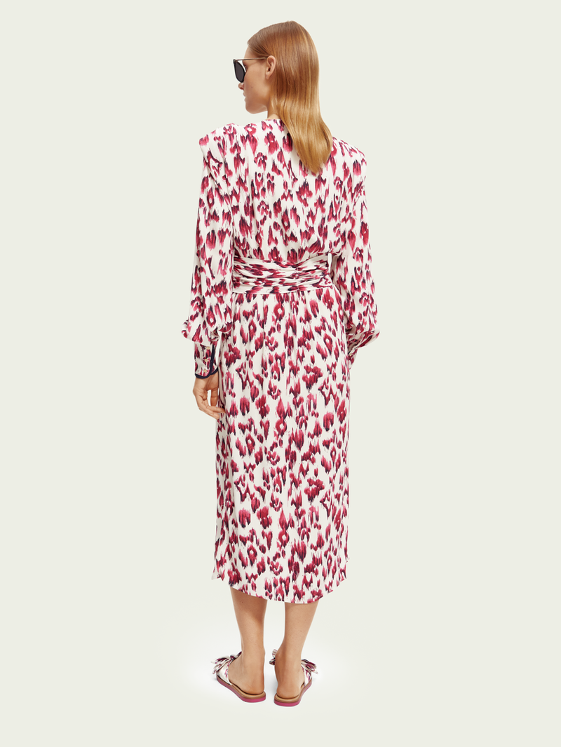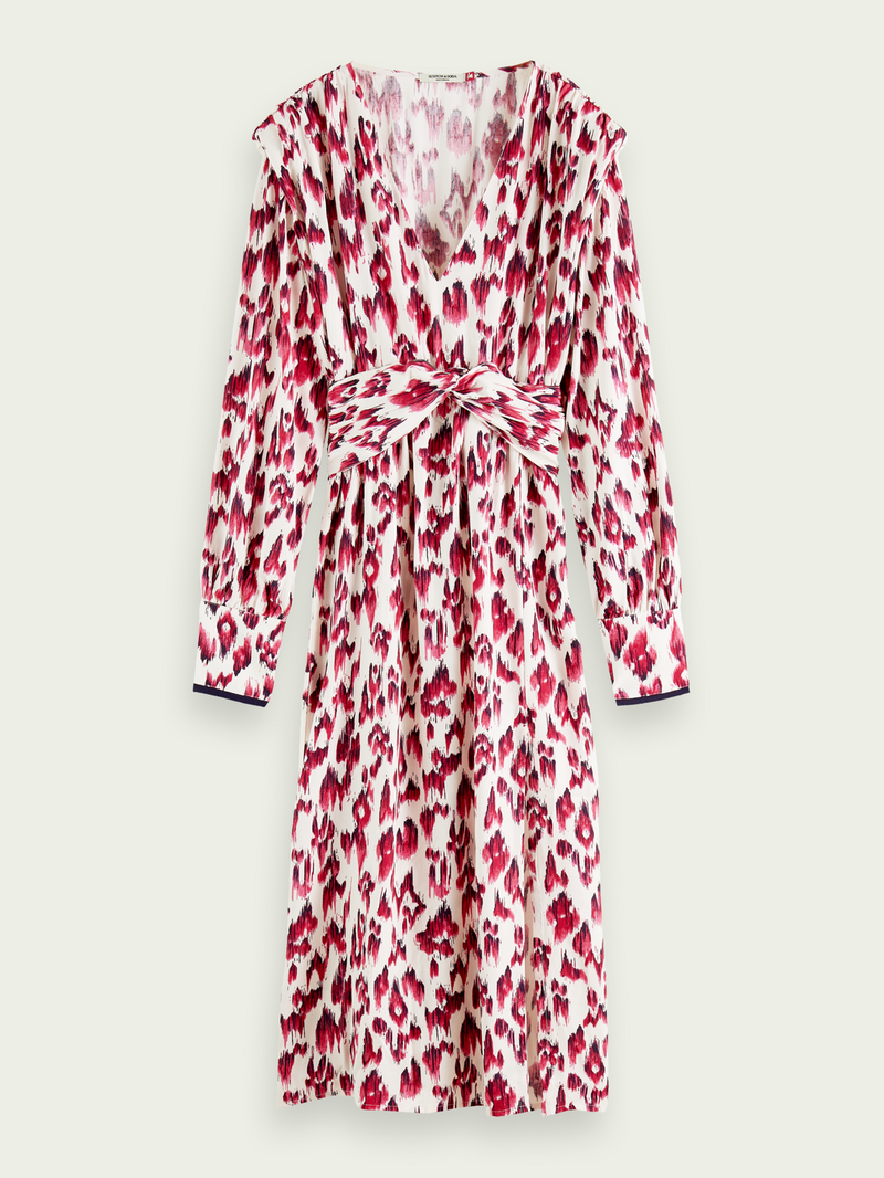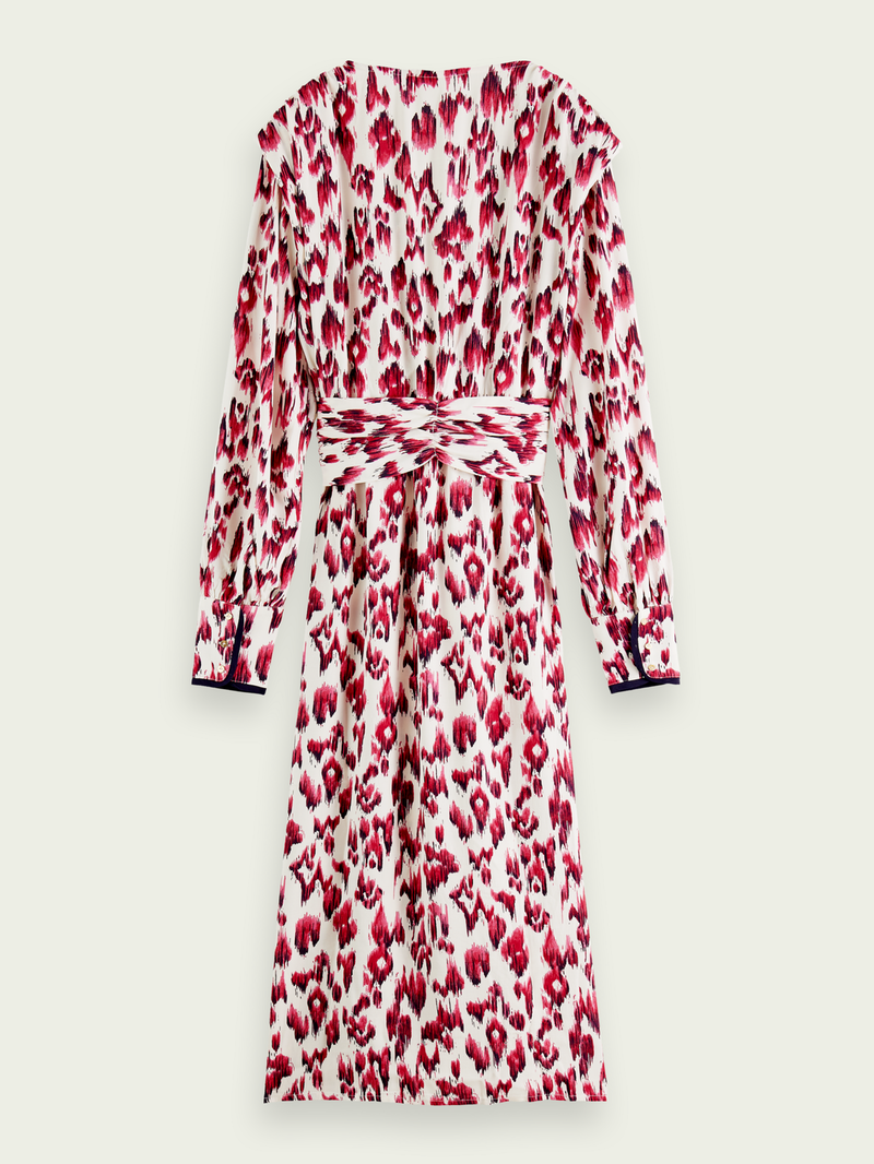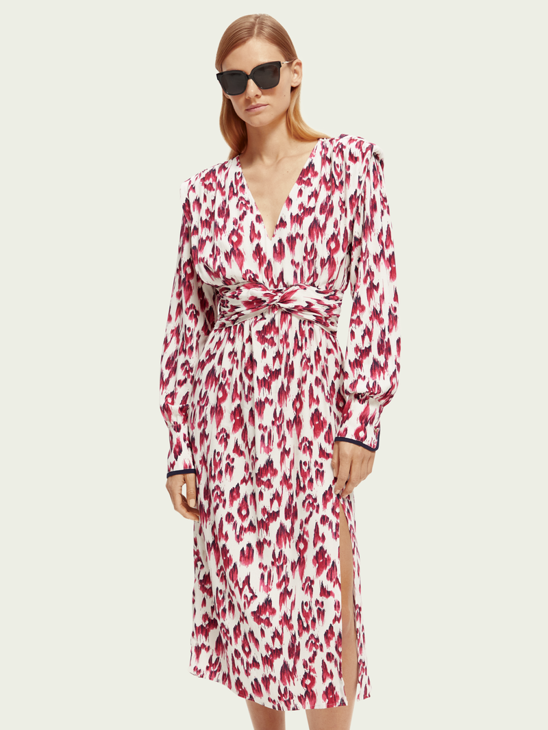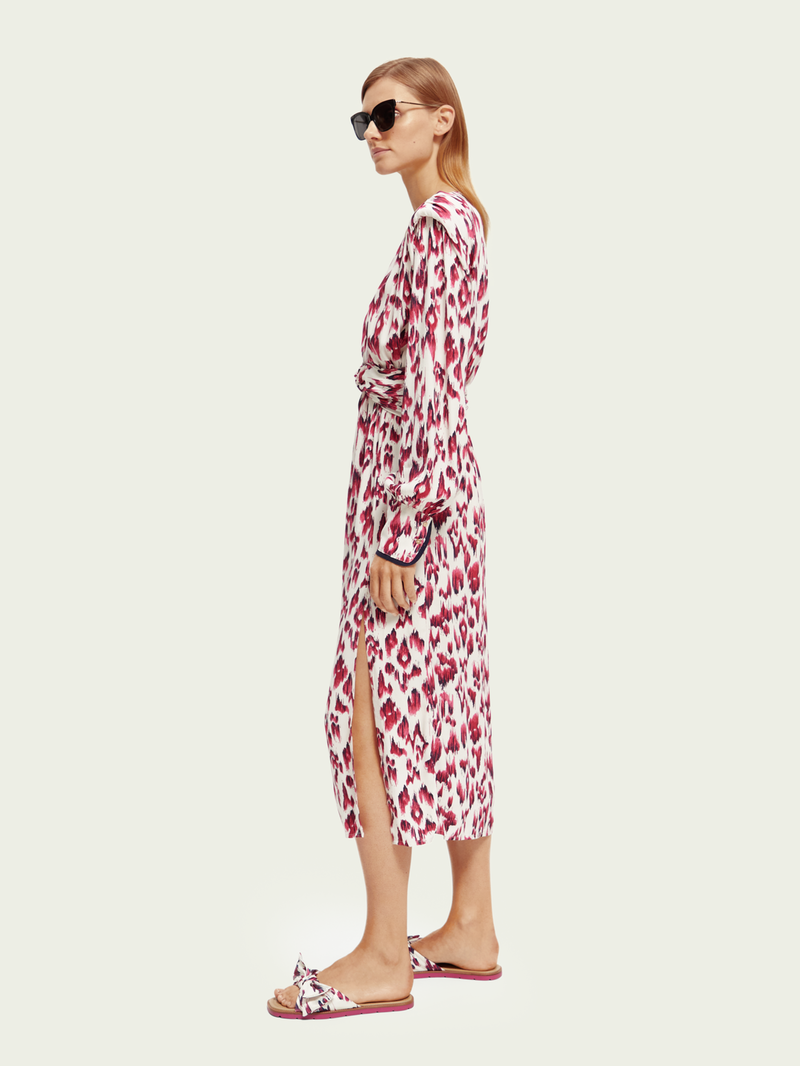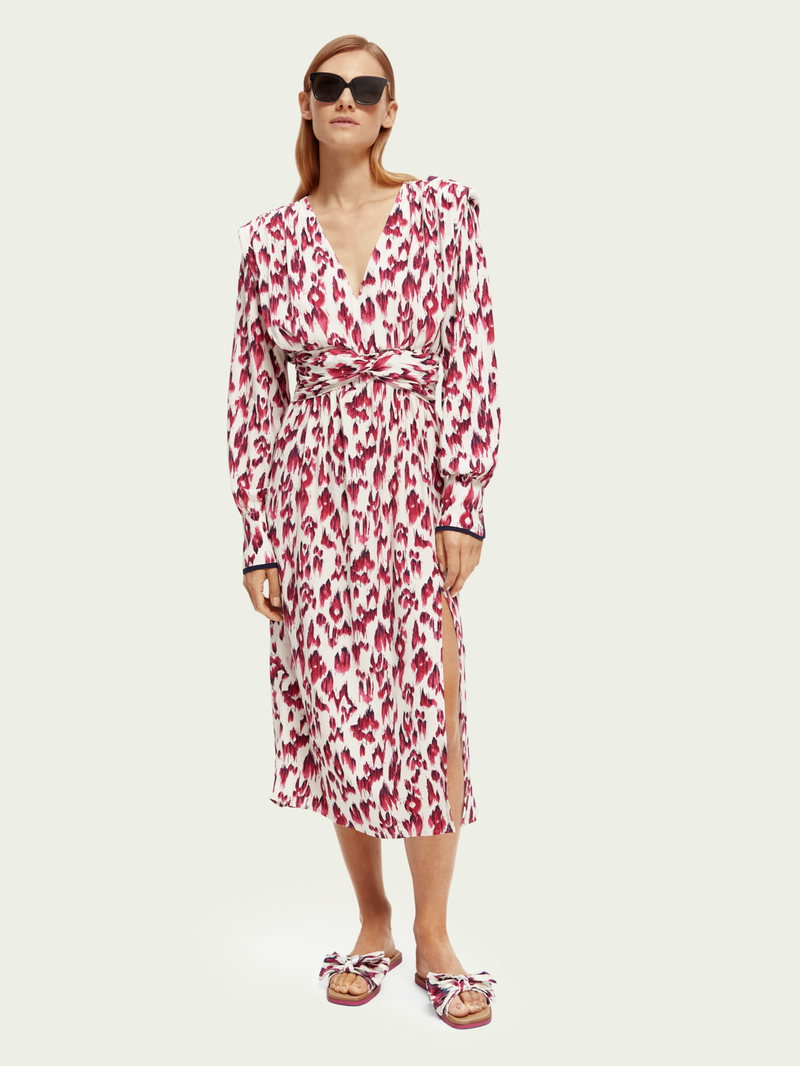 This midi dress features a belted waist and V-neck collar. Scotch and Soda has defined the shoulders of this dress, rounding out the long-sleeves with a three-button placket at the cuff - and finished this look with a left-side slit.