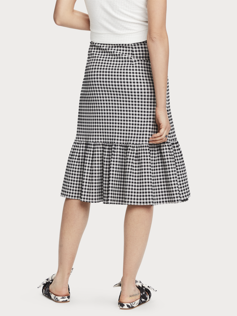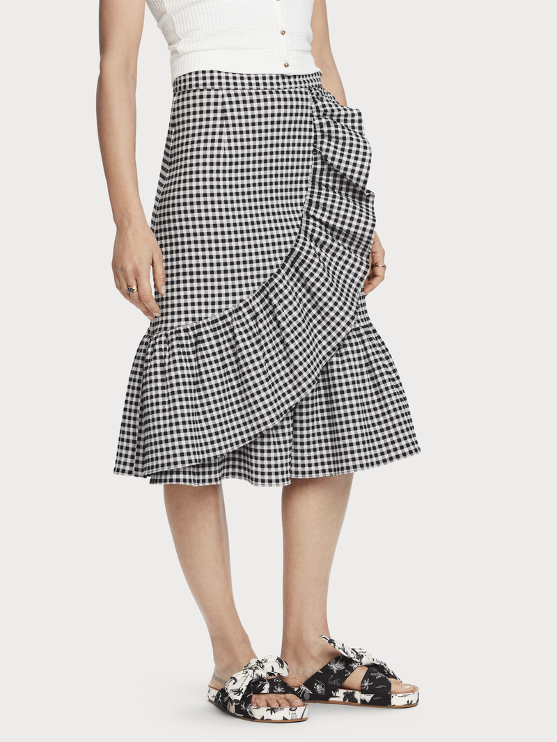 Scotch & Soda gives a feminine twist to this gingham wrap-over skirt with a bold ruffle detail along the hemline. The skirt is crafted in a structured fabric with a hint of stretch.