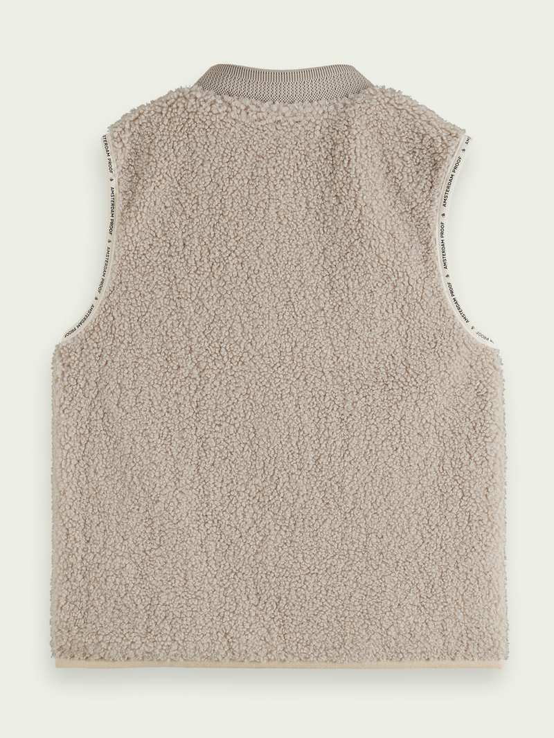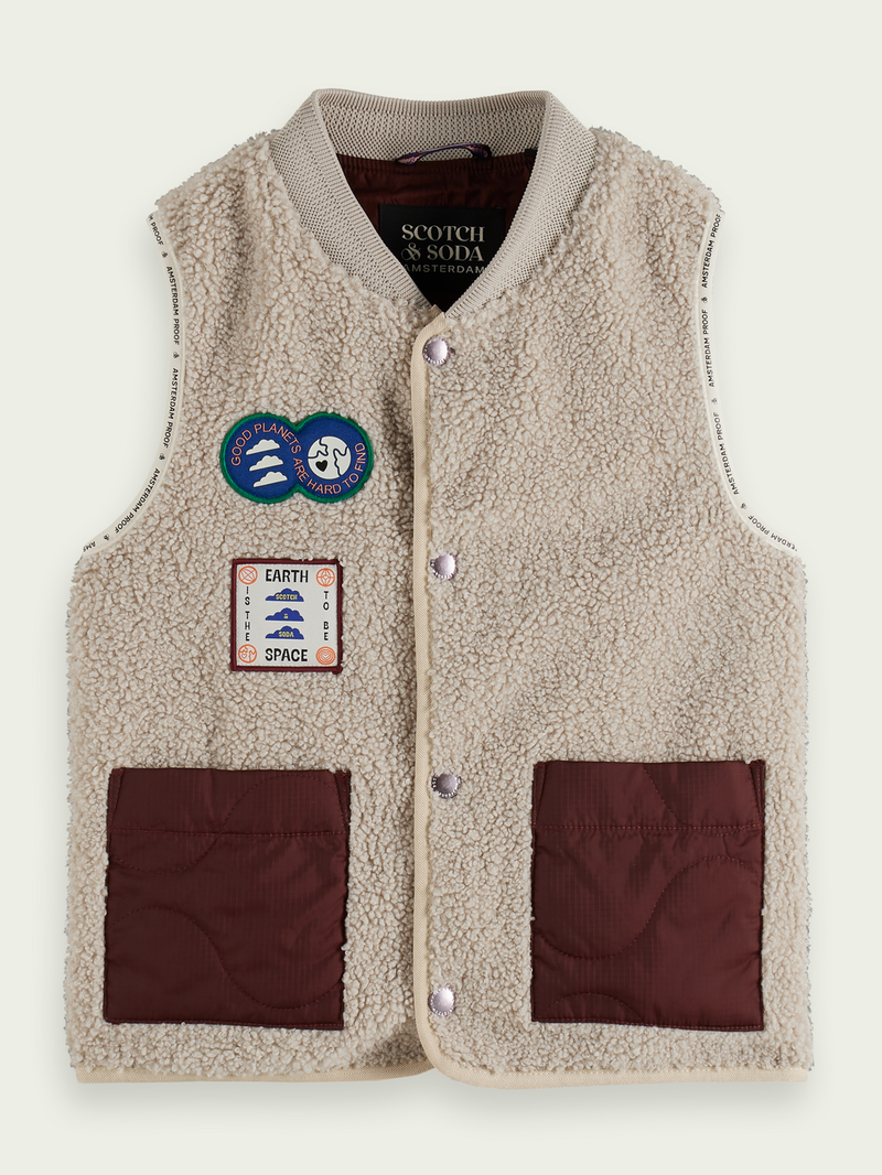 Keep warm in our Amsterdam Proof vest, inspired by the functionality needed to stay ahead of the weather in Amsterdam and beyond. Designed with a teddy exterior with special collection edition patches and quilted pockets, it is the perfect piece to wear over a sweatshirt or underneath our rainwear styles.