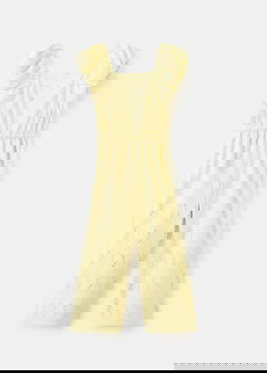 Time to get groovy in this one-piece. This off-shoulder jumpsuit was cut from textured fabric and features bouncy sleeves with ruffles and tiers. To add to the design's playfulness, we added a bow tie at the centre of the waist and a fun stripe.
