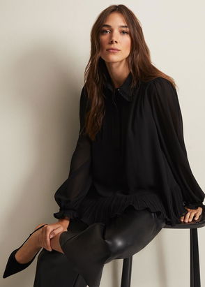 Printed, sheer, and ruffled - this top has got it all. Pair with a black skirt or trousers for a stylish look.