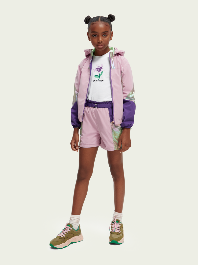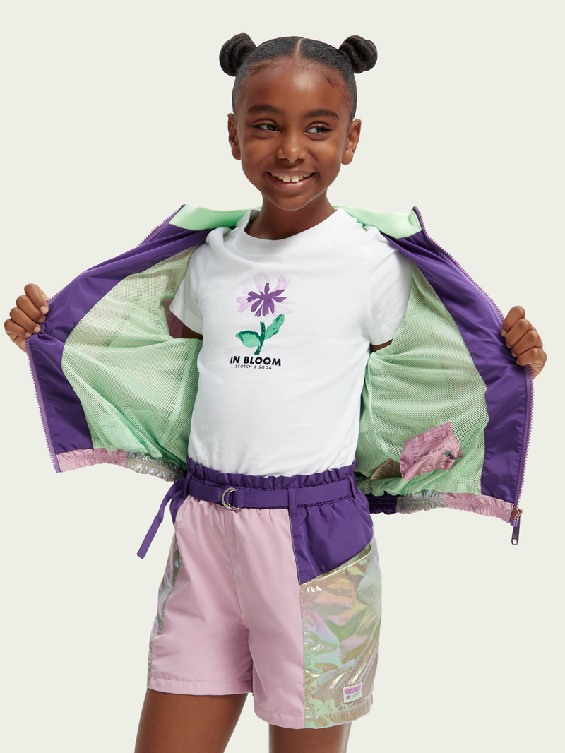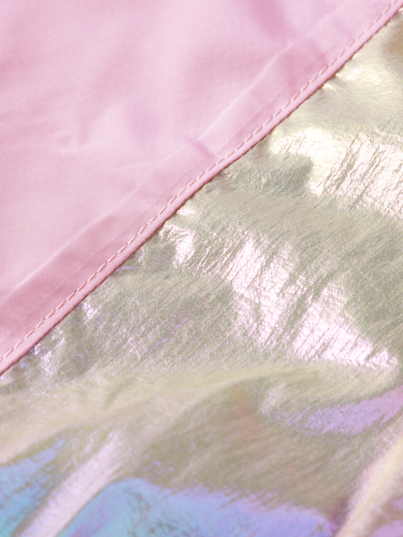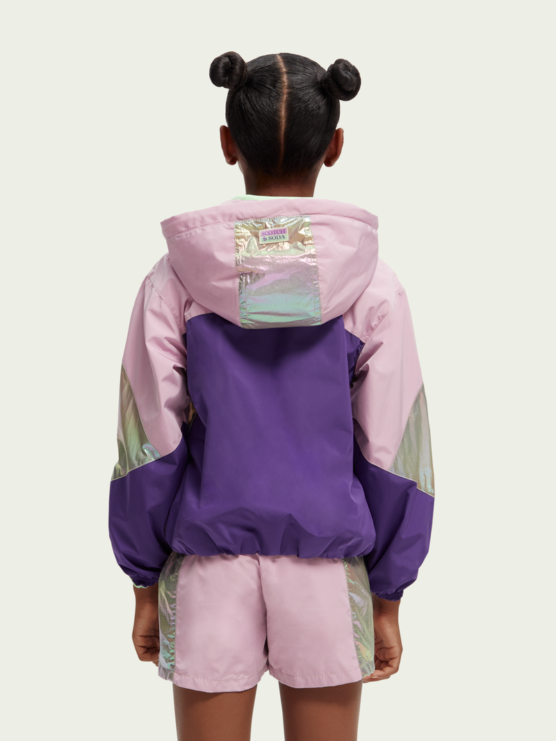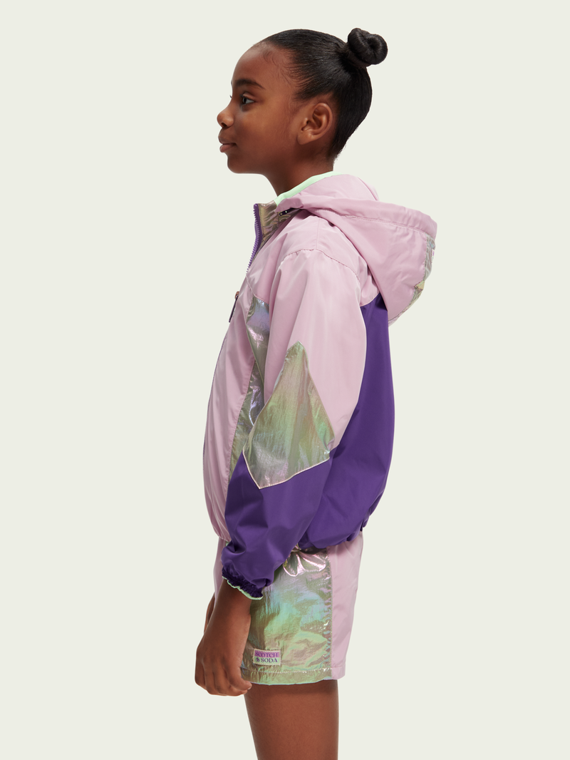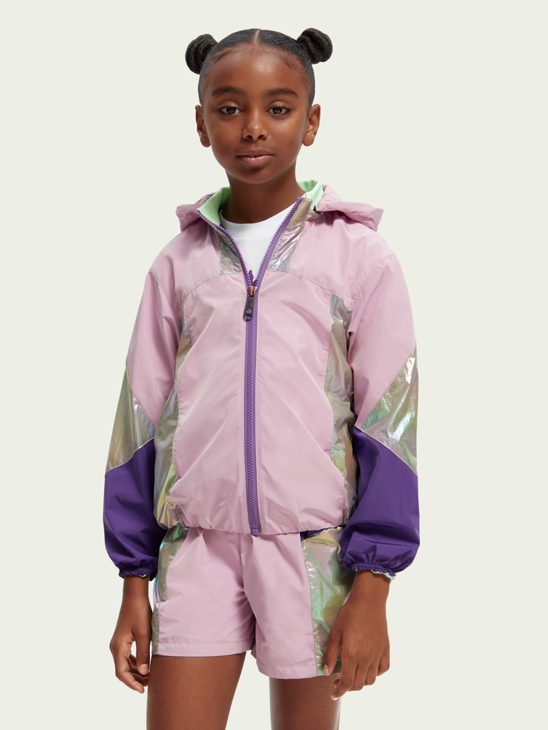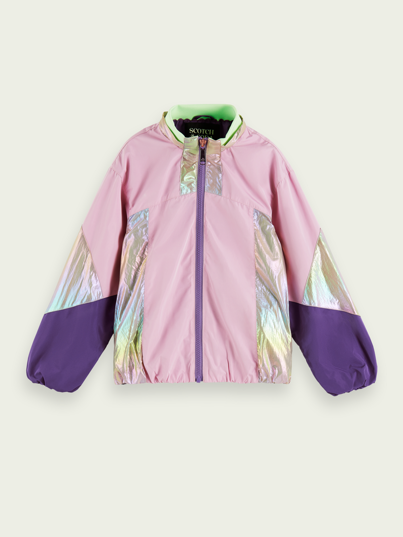This jacket comes with a striking colour-block design - complete with pearlescent accents. Finished with a complementary toned inner-lining, this zip-through jacket is a perfect any-time style.