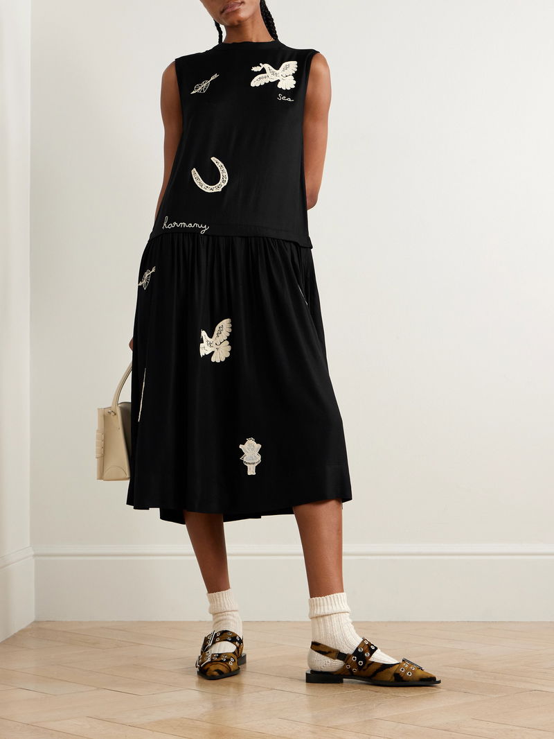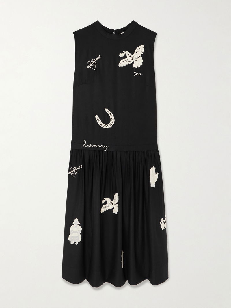 Sea's 'Ellison' dress is dotted with motifs inspired by folklore. It's made from twill with a sleeveless bodice with gathered skirt. The drop waistline is prettily embroidered with 'harmony' in cursive.