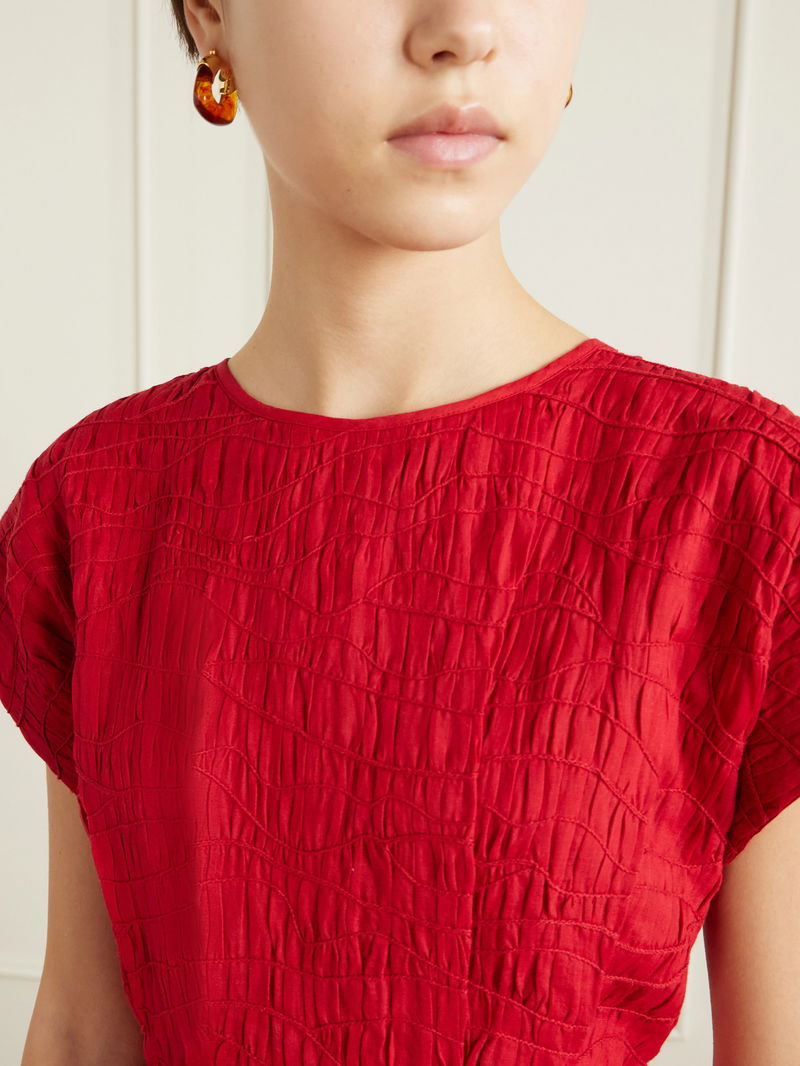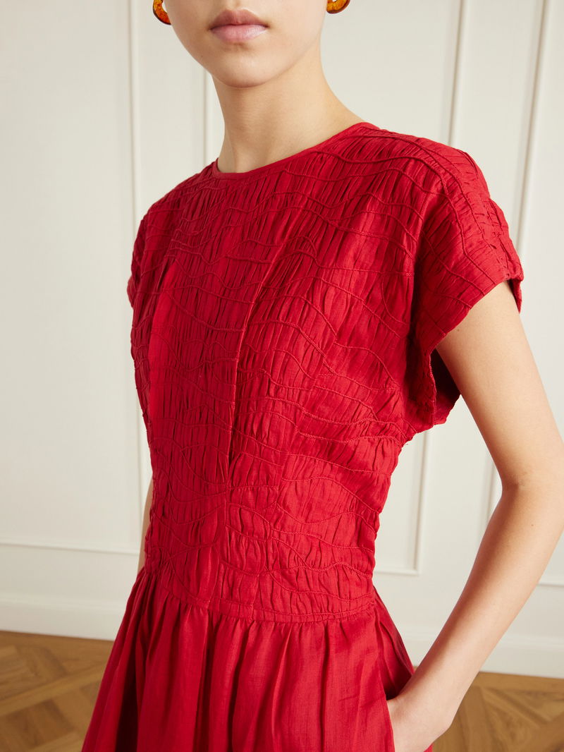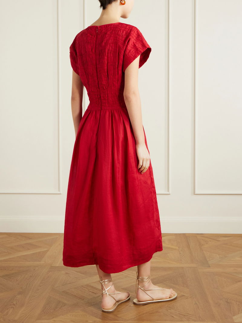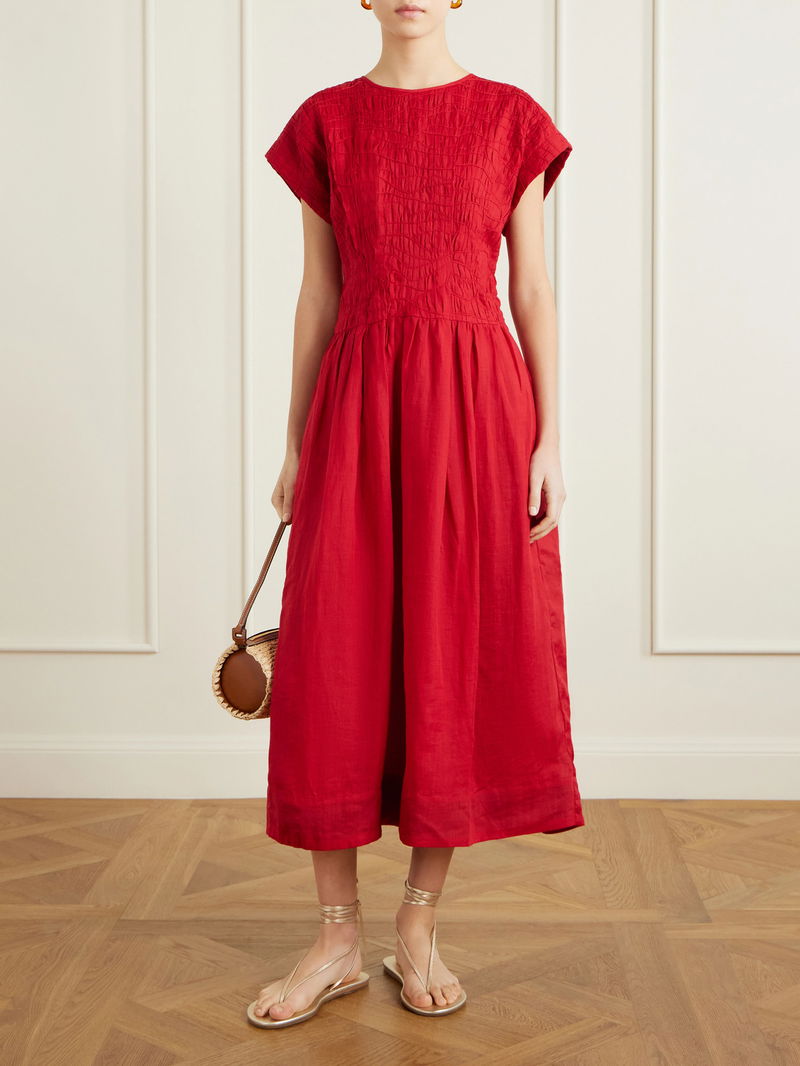 Sea's 'Imogen' dress is a vision in red. Made from ramie, it has a swirl of smocked detailing and cap sleeves that round the look together. It's defined by a nipped-in waist before flaring to an A-line skirt.