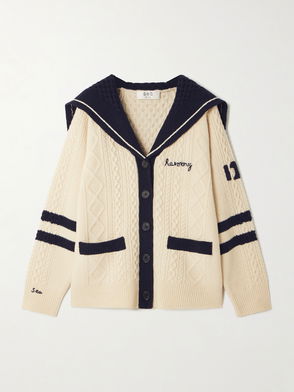 Description: Sea's 'Marie' cardigan has a crocheted cotton collar that extends along the back, spelling out the brand's name amongst floral motifs. It's knitted from warm merino wool and has small stripes on the cuffs. Style yours as part of a tonal outfit. - Net a Porter Materials: 100% merino wool; trim: 100% cotton Product Code: 46376663162873807