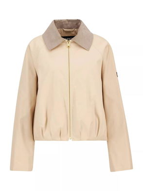 Cotton broadcloth jacket. Corduroy trim and embroidered graphics and text throughout.