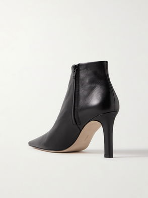 Black boots with a pointed toe, tapered heel and ankle height, made with a supple leather.