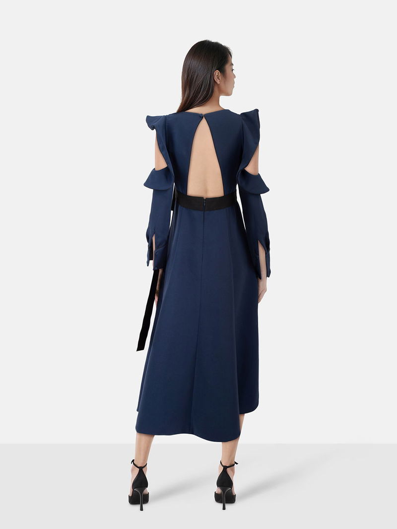 Brand new with tags belted navy midi dress with cold shoulder detail and asymmetric hem. Open back. Back neck and zip button fastening.
