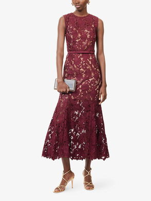 Self-Portrait guipure lace dress. Crepe notched lapels, crystal-embellished buttons, two press-stud fastening crepe pockets, detachable belt, crepe trims, scalloped hem, detachable slip lining. Concealed press-stud fastenings through front.