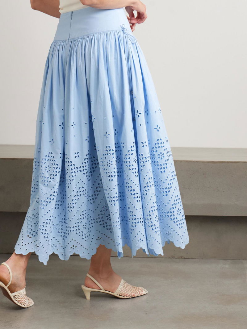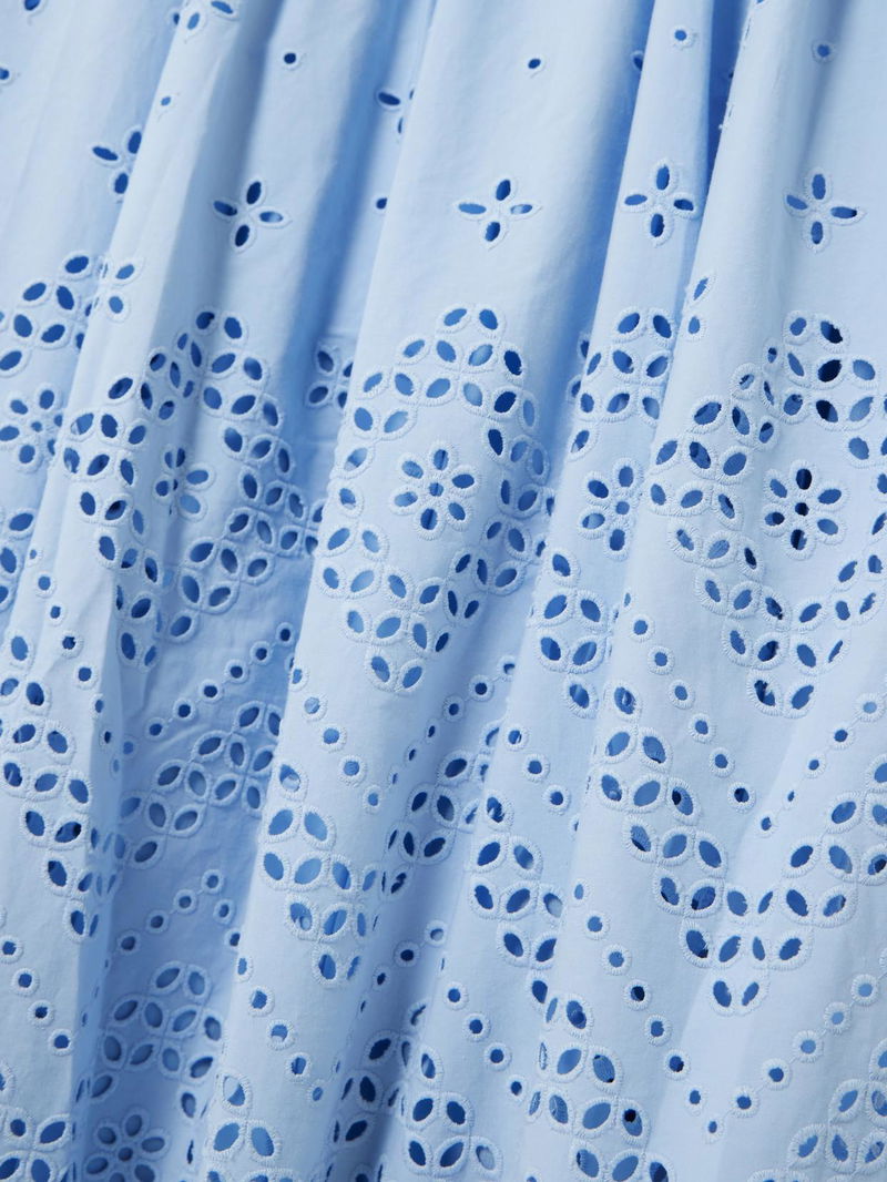 Made from broderie anglaise cotton, it has a dropped waist threaded with drawstring ties and flares out to a scalloped hem.