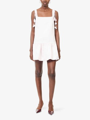 Self-Portrait cotton shirt dress. Broderie anglaise, gathers at shoulders and waist, belt loops, detachable belt, side slip pockets, box pleat at back, scalloped trims, detachable slip lining. Concealed button fastenings through front.