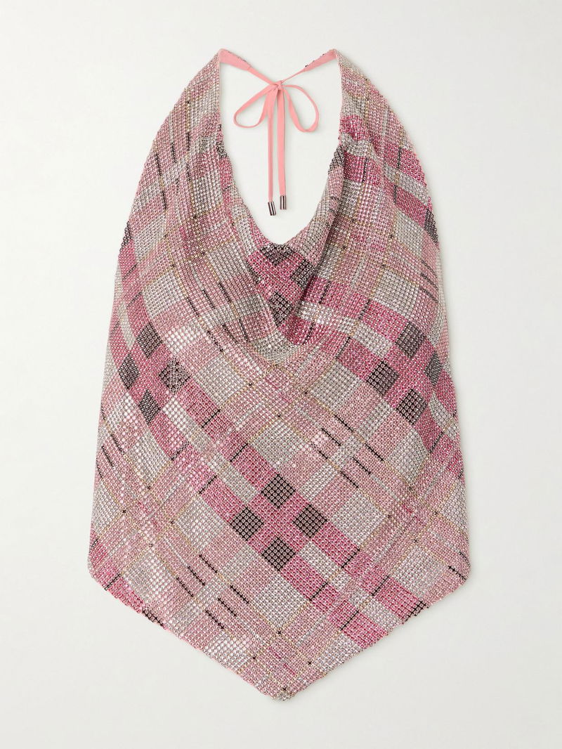 Self-Portrait’s halterneck top channels the playful glamour of early 2000s nightlife. Made from faille, it's overlaid with chainmail set with crystals that form a checked motif and has a ties at the nape and back to adjust the fit. Pair yours with the coordinating low-rise mini skirt.