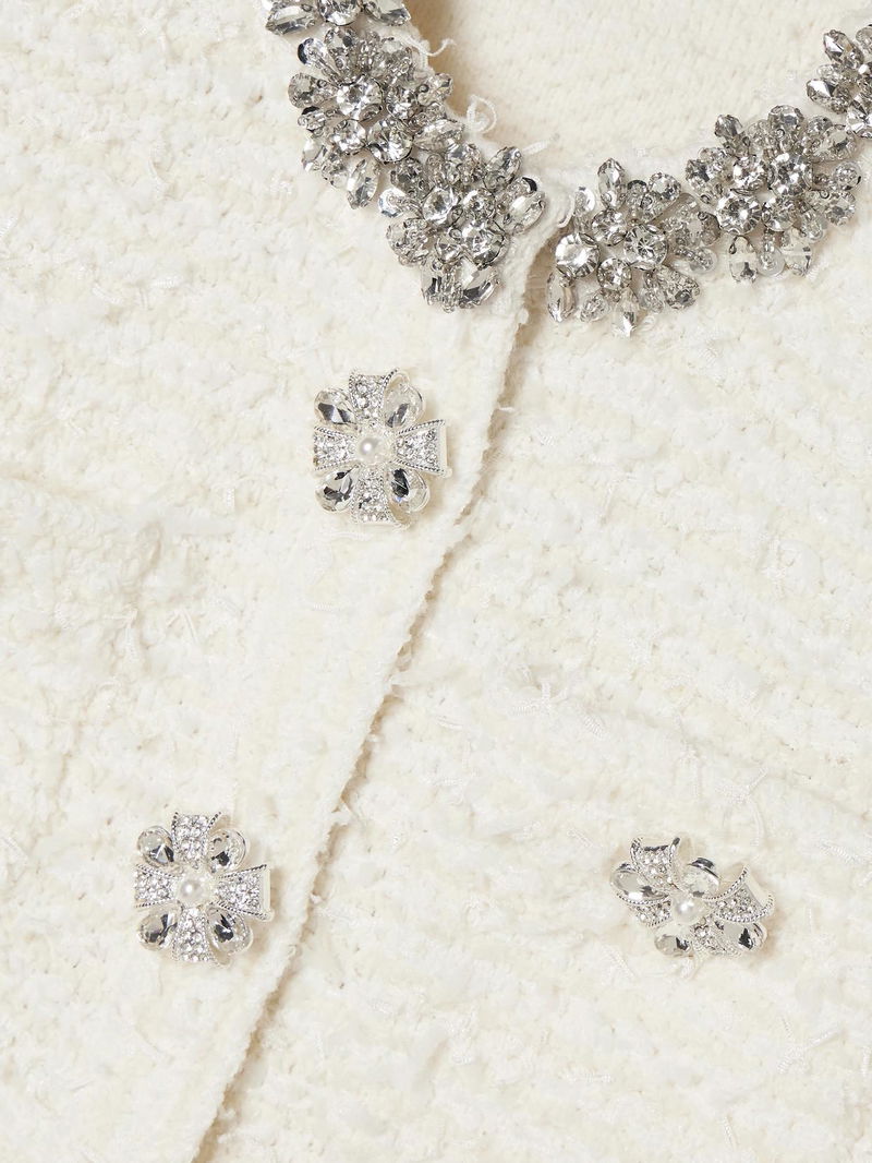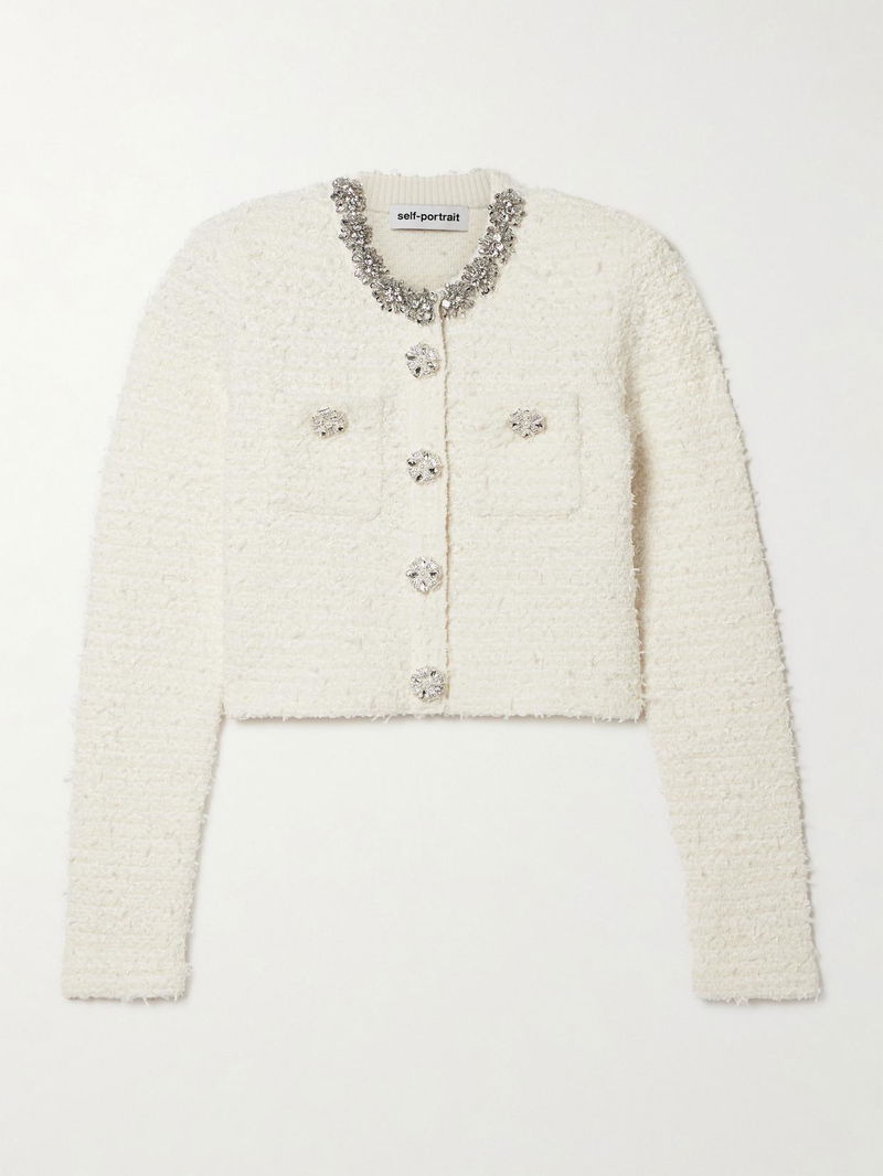 Sitting halfway between knitwear and a jacket, this cardigan is as glamorous as you might expect of Self-Portrait. Made from cotton-blend bouclé, it's encrusted with sparkling crystals at the neckline and has coordinating buttons, so you won't need too much jewelry. We love it with the coordinating mini dress or blue jeans.