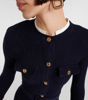 Jewelry-like embellishments are a Self-Portrait signature - this dress is traced with sparkling crystals that take the place of a necklace. It's made from light-blue stretch-knit that's ribbed in different directions at the fitted bodice and voluminous skirt.