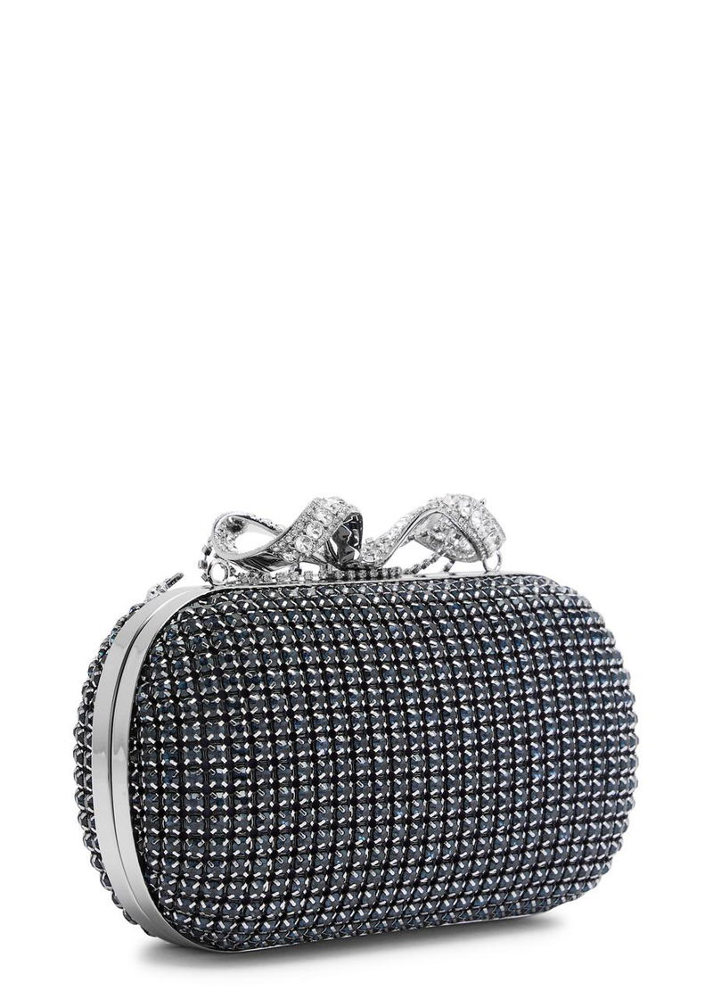 • Detachable chain shoulder strap, crystal embellishments, metal bow plaque with fringe embellishments, internal card slot, fully lined