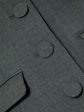 Self-Portrait’s white dress spotlights a serene take on Han Chong’s elegant occaisionwear-focused vision. The fluid satin is draped to puffed shoulders with crystal embellishments along the seams and long keyhole-buttoned sleeves, then falls from a V-shaped waistline to an A-line skirt.