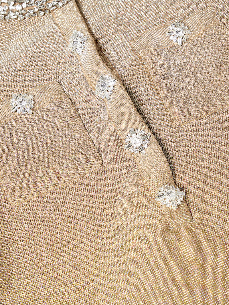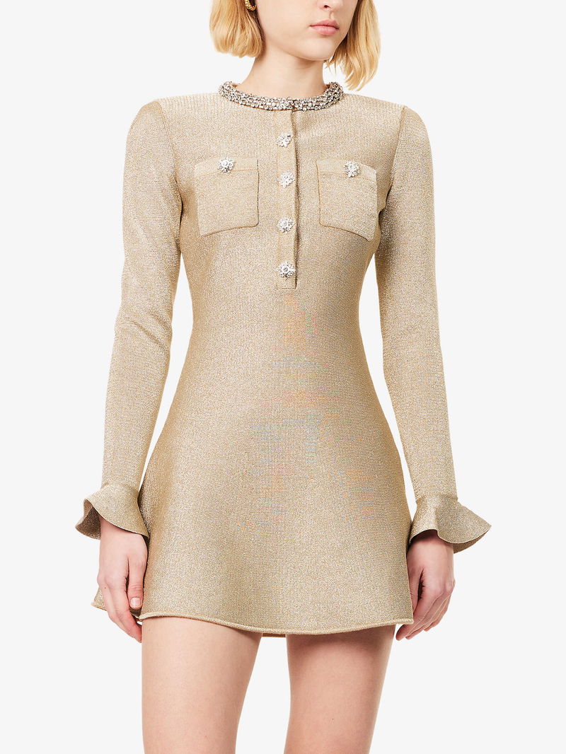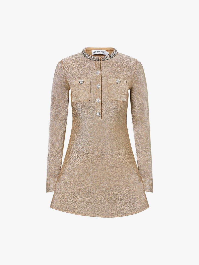 Self Portrait knitted mini dress. Slim fit, round neck, padded shoulders, front buttons and pockets, metallised fiber, knitted.