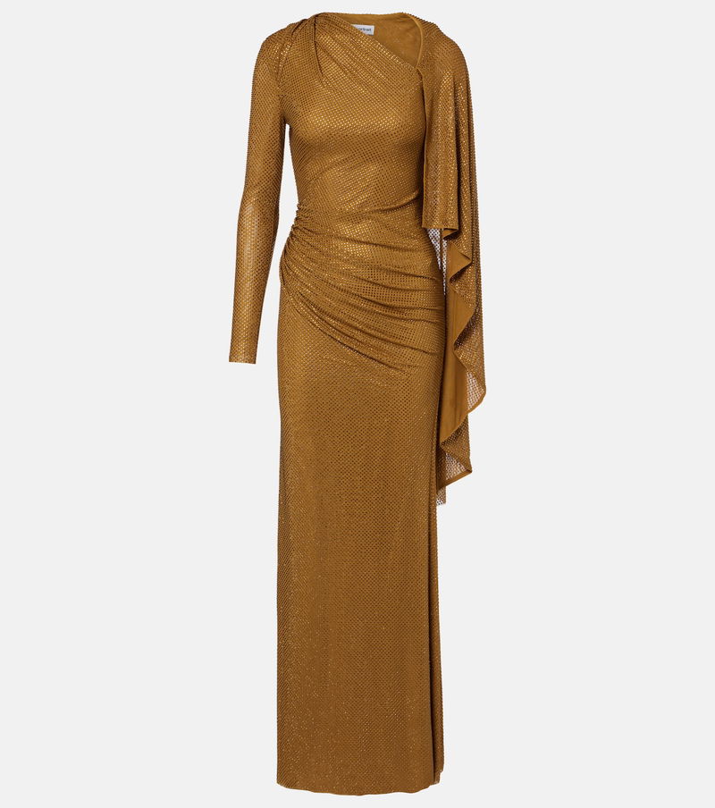 With a mission to celebrate women in every design, Self-Portrait has built a strong cult following for its soft graceful aesthetic. Made from soft mesh, this gown features a cape detail, soft draping, and a shimmering layer of tonal crystals.