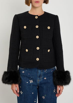 The boxy silhouette of Self-Portrait's checked cream twill jacket is reminiscent of 1950s tailoring. It's expertly shaped with a point collar and a black grosgrain bow tie, then fastens down the front with enamelled floral buttons encasing faux pearls for a luxe twist.