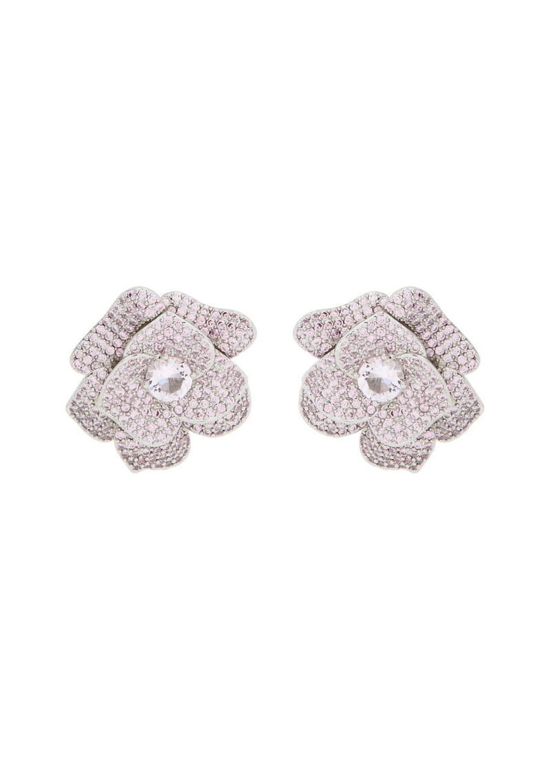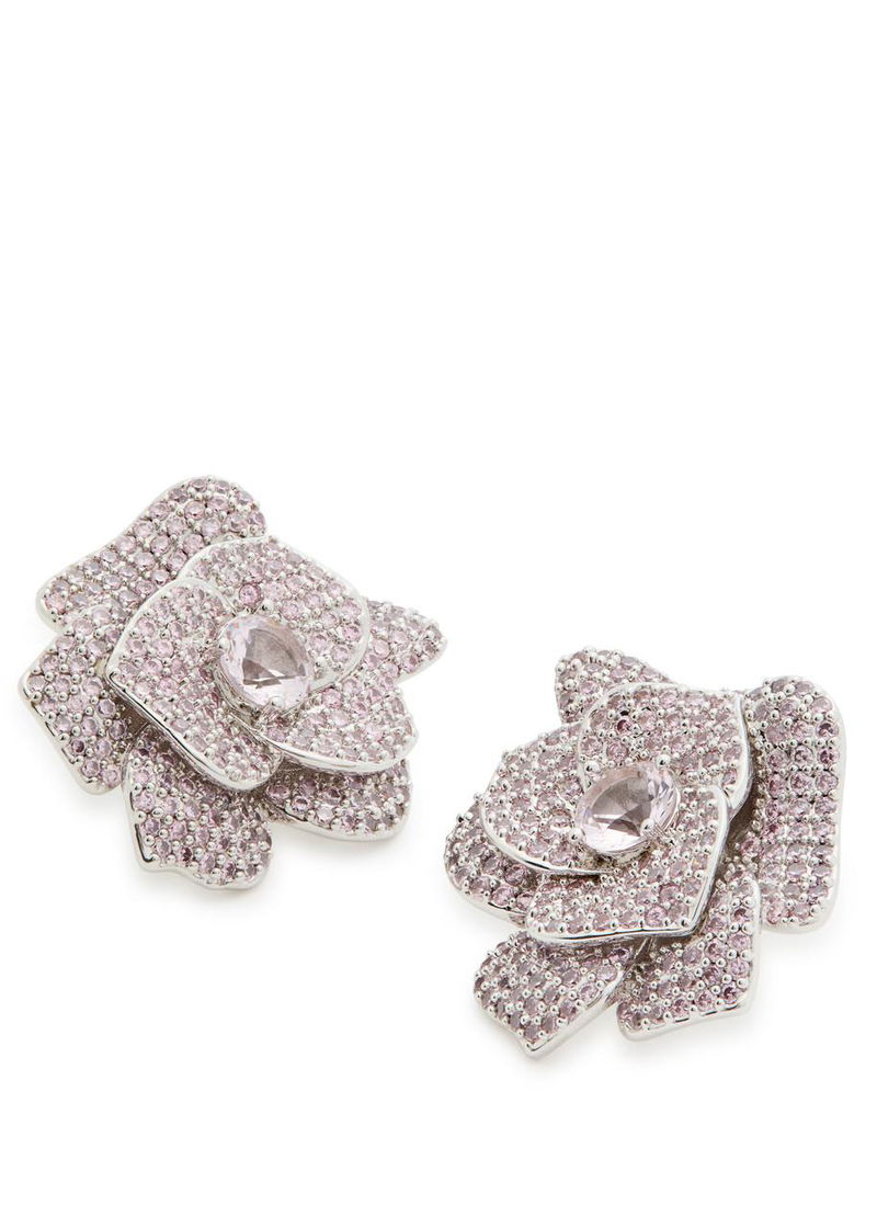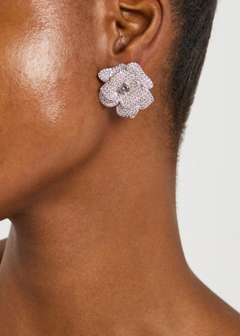 Self-Portrait metal stud earrings. Floral design, crystal embellishments, designer engraved. Post fastening for pierced ears. Presented in a designer-stamped box.