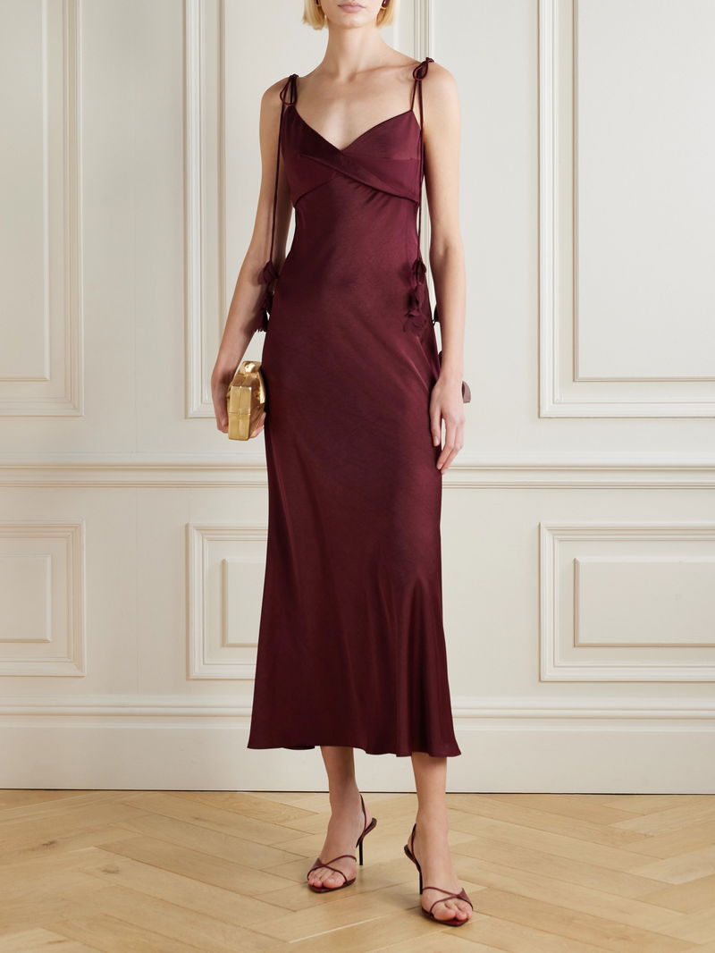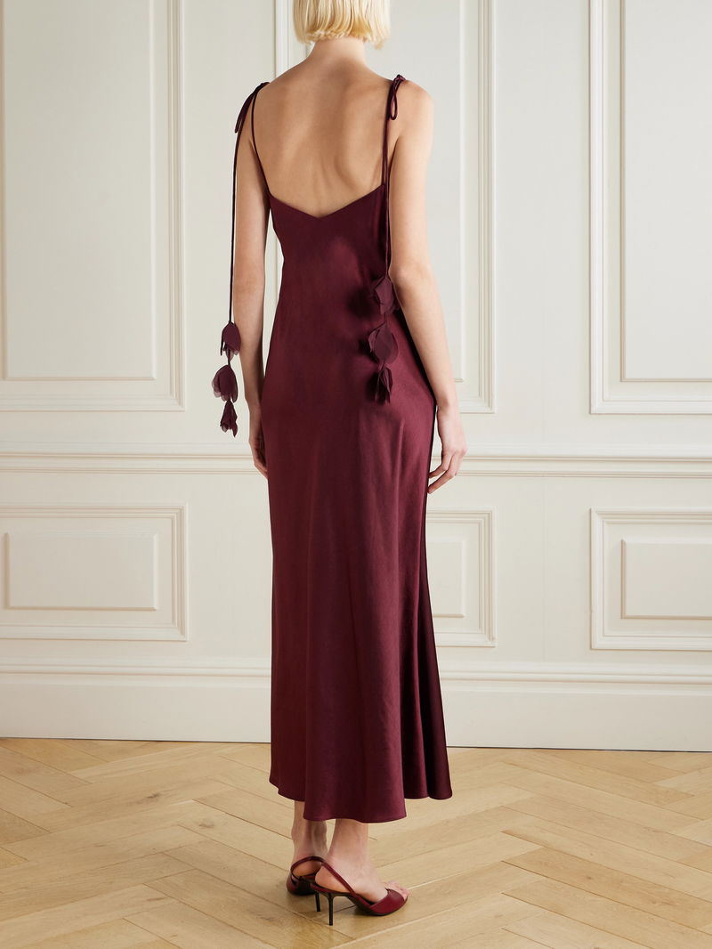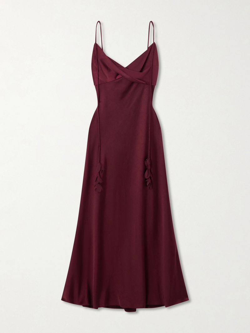 The elongated straps of Self-Portrait's dress are appliquéd with georgette to resemble flowering vines. Made from lustrous satin, it has a draped V-neckline and skims your figure all the way to the midi hem. Complement the burgundy shade with gold accessories.