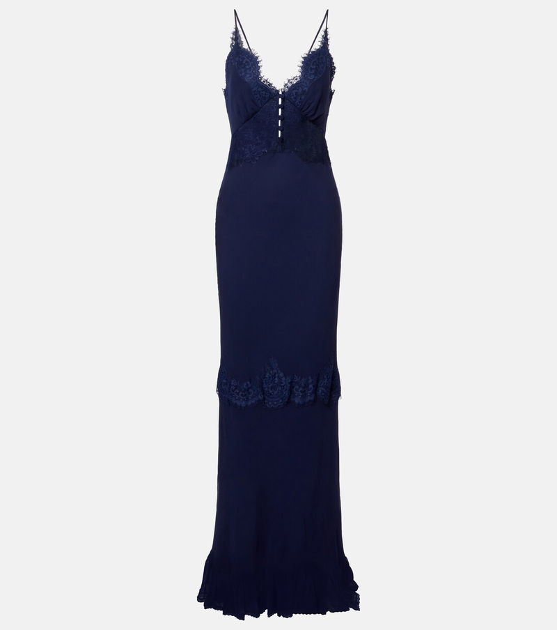 Self-Portrait has built a strong cult following for its soft, graceful aesthetic. Crafted from georgette, this gown features an elegant scalloped neckline, lace trims, semi-sheer paneling at the waist, and a low back.
