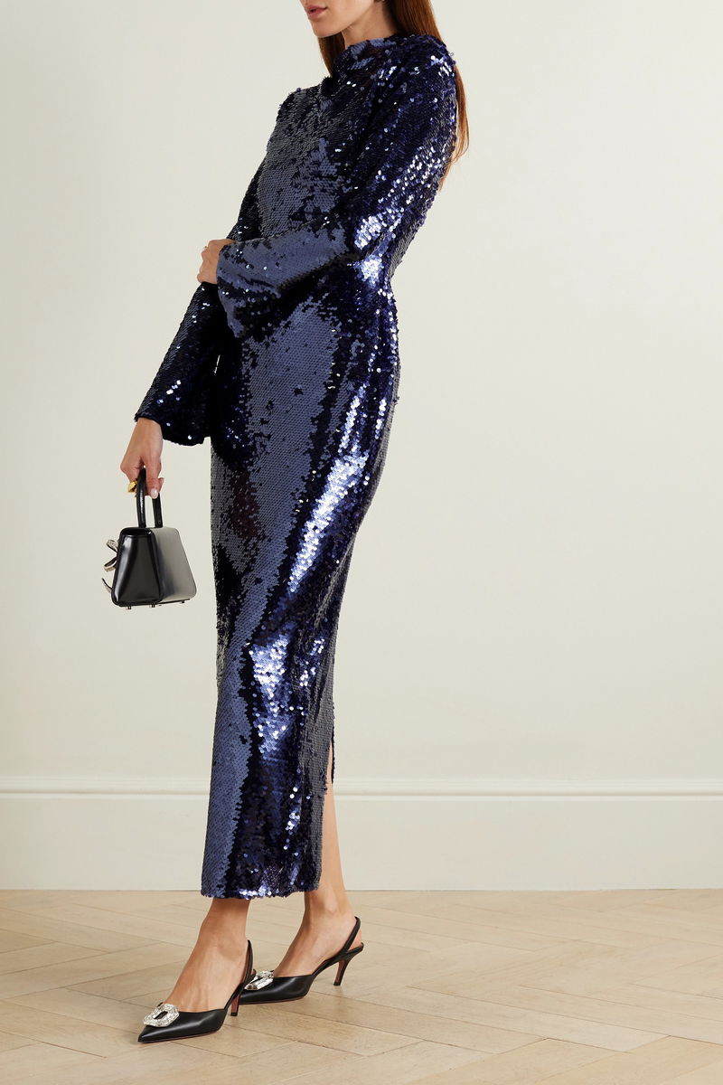 When it comes to occasionwear, Self-Portrait has all the bases covered. This midi dress is saturated in navy sequins, so it'll stand out even in the most crowded venue. The long sleeves and high neckline are balanced by an open back.
