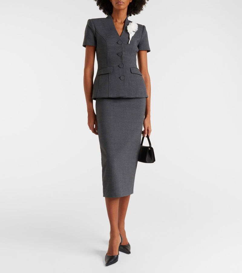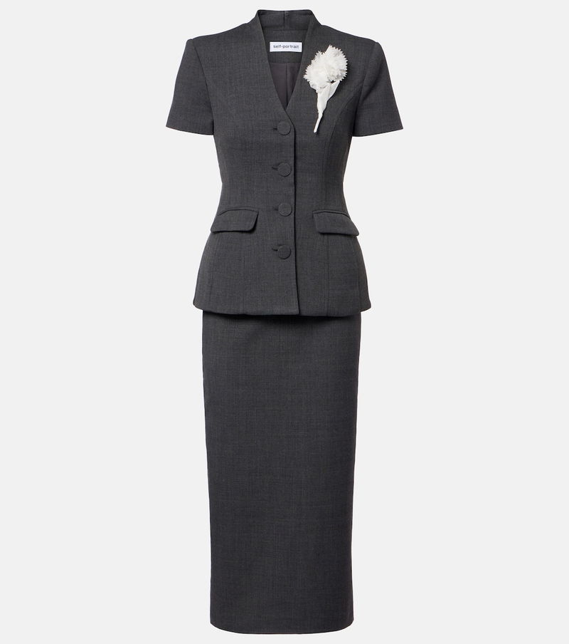 With a mission to celebrate women in every design, Self-Portrait has built a strong cult following for its soft, graceful aesthetic. This peplum tailored midi dress with shoulder pads boasts an hourglass silhouette and a sculptural flower brooch on the front.