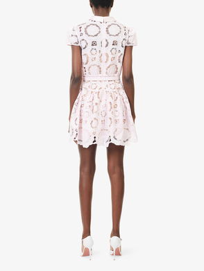 Self-Portrait combines a ladylike silhouette with alluring black lace to create this party-ready mini dress that's panelled from sheer floral and honeycomb lace. Featuring a demure point-collar and puffed sleeves, it overlays a beige satin sweetheart-cut lining, then gently flares out to a ruffled skirt. Style it with a faux-pearl embellished bag for a youthful evening edit.