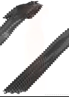 Self-Portrait stretch-woven midi dress. Slim fit, band-collar, padded shoulders, short sleeves, all-over rhinestone embellishment, all-over mesh texture, contrast lining, flared hem.