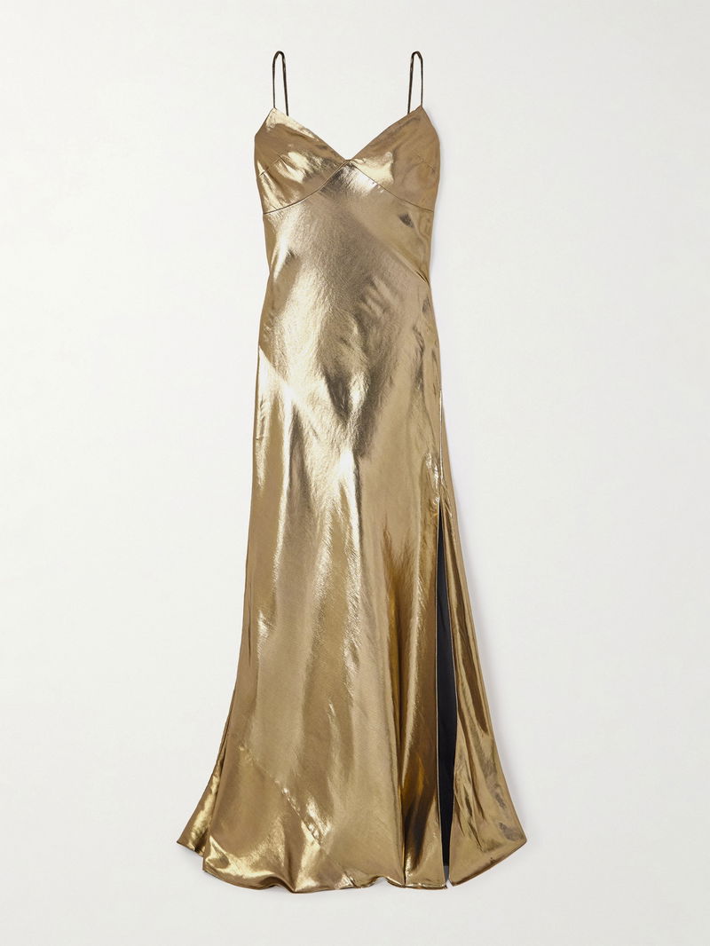 Self-Portrait's maxi dress is inspired by slinky styles of the '90s. Set on slim spaghetti straps, it's cut on the bias from metallic satin and has a thigh-high slit.