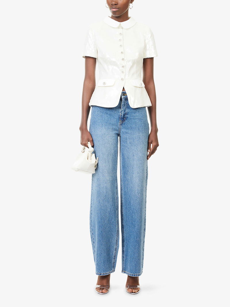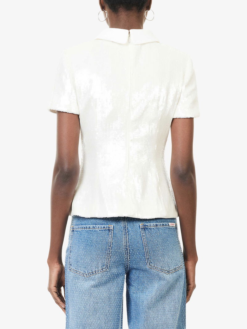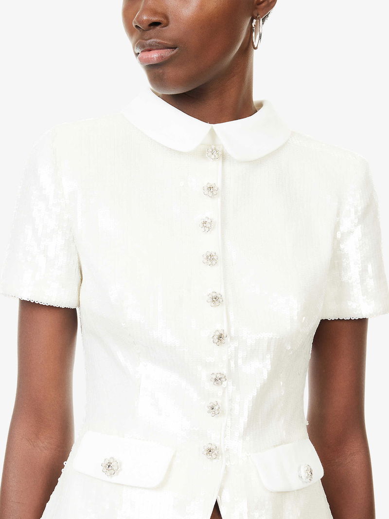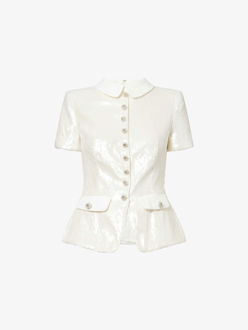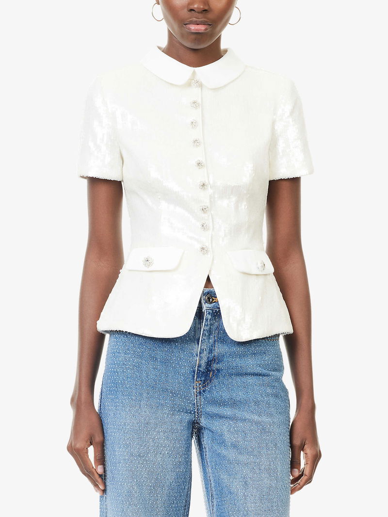 Slim fit, peter-pan collar, padded shoulders, short sleeves, two buttoned pockets and crystal floral buttons at front, all-over sequin embellishment, fully lined, contrast crepe trims.