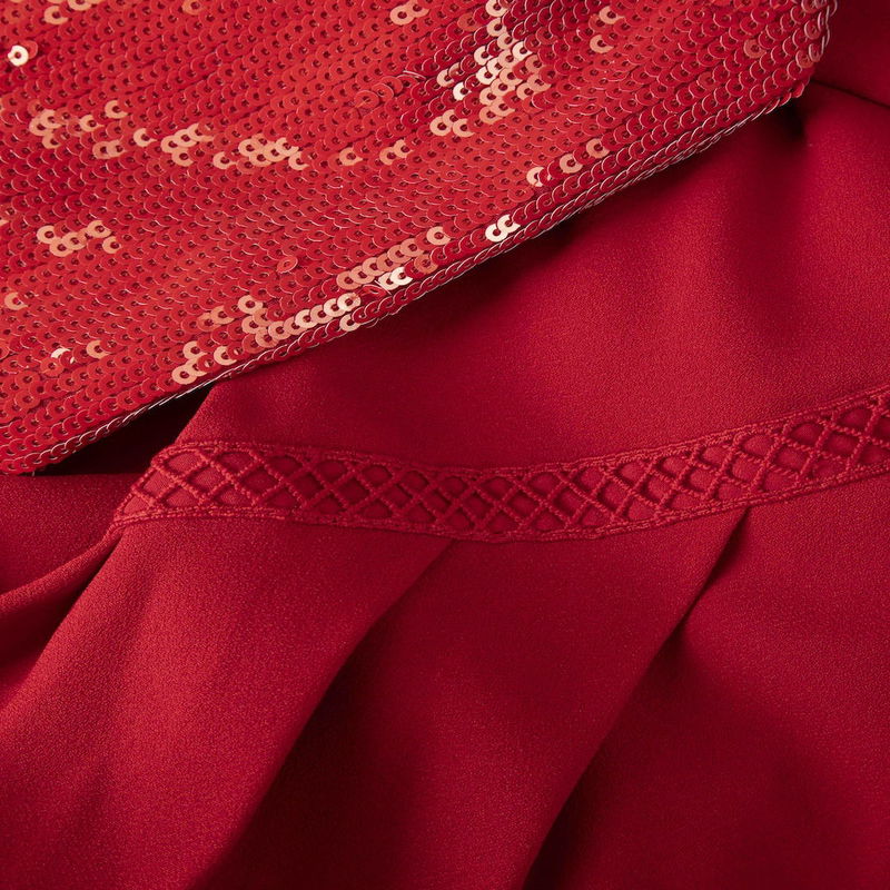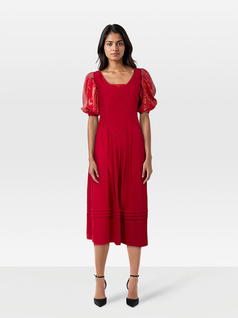 Red midi dress with sequinned puff sleeves in excellent condition. Repaired at the front on the skirt - see images for details. Side zip fastening.