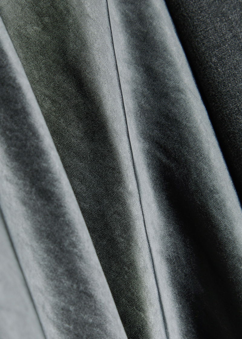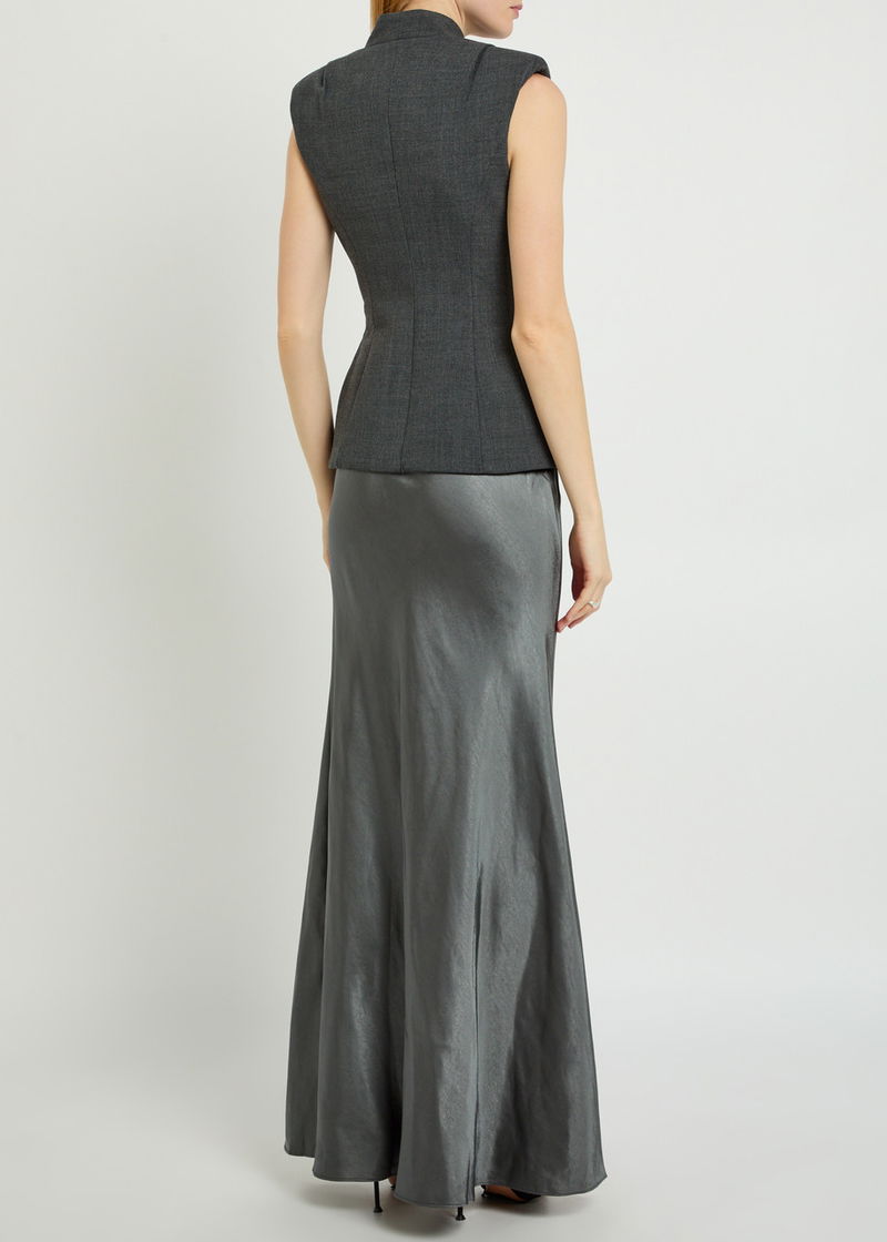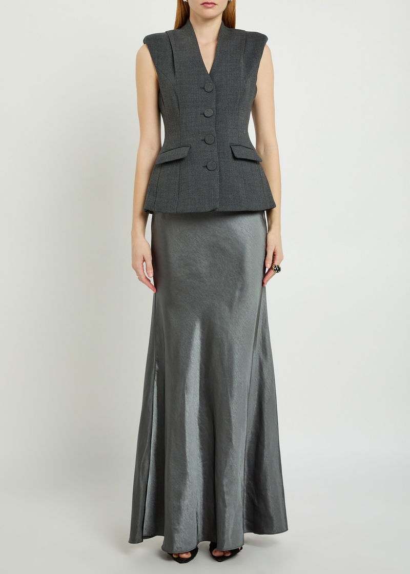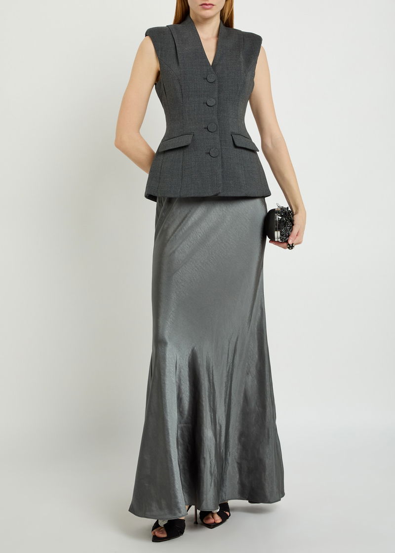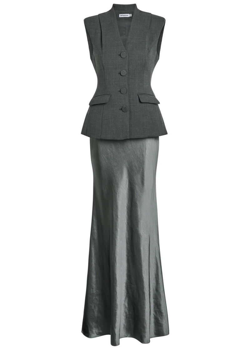 V-neck, padded shoulders, front flap pockets, detachable satin skirt, partially lined.