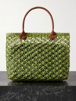 Sensi Studio celebrates traditional Ecuadorian craft in its signature woven-straw designs such as this natural beige toquilla basket bag with pompoms and bamboo handles.