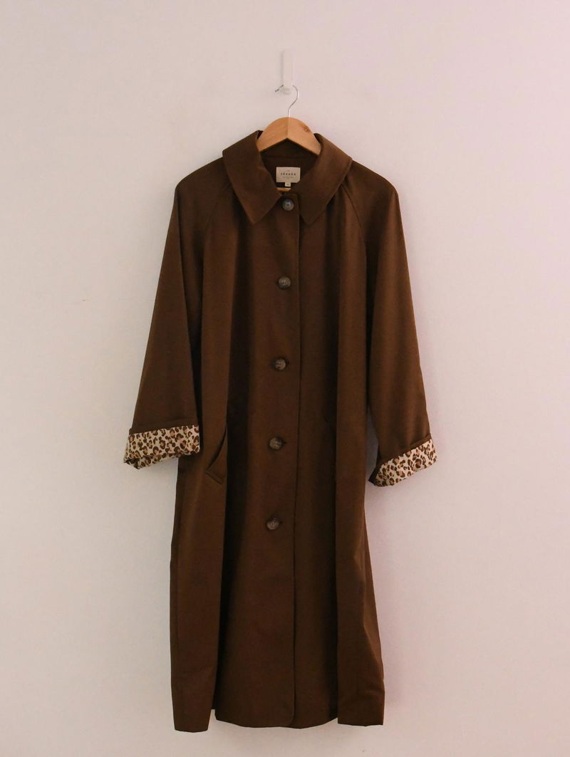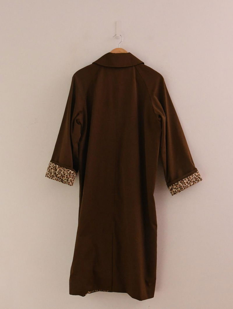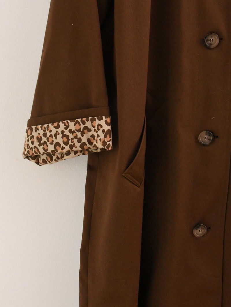 Clyde Coat is and oversize trench coat. Classic collar. Button fastening on the middle front. Leopard print lining. Water-repellent material.