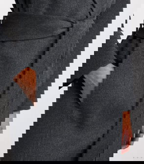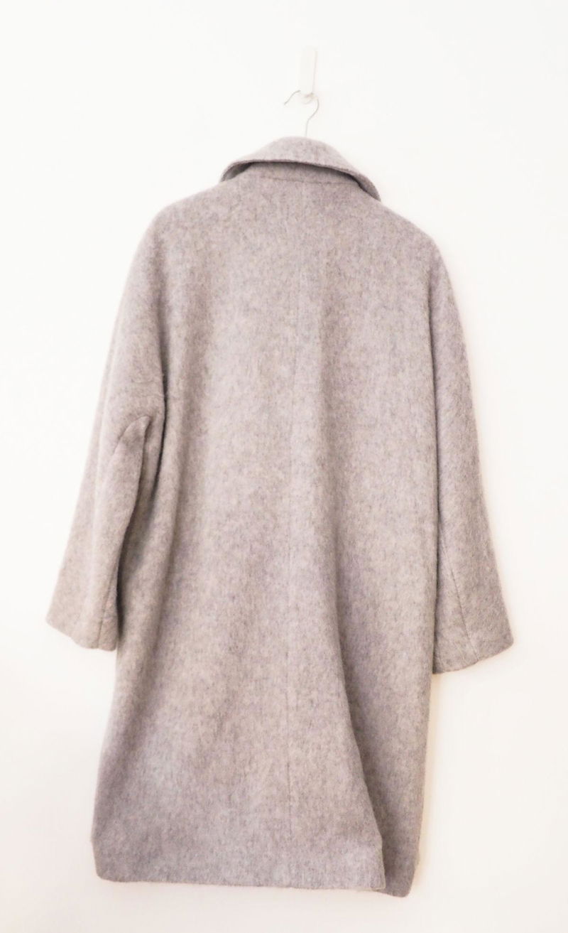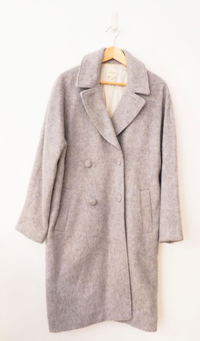 Grey knee-length double-breasted coat in excellent, pre-worn condition with a tailored collar, raglan sleeves and side pockets.