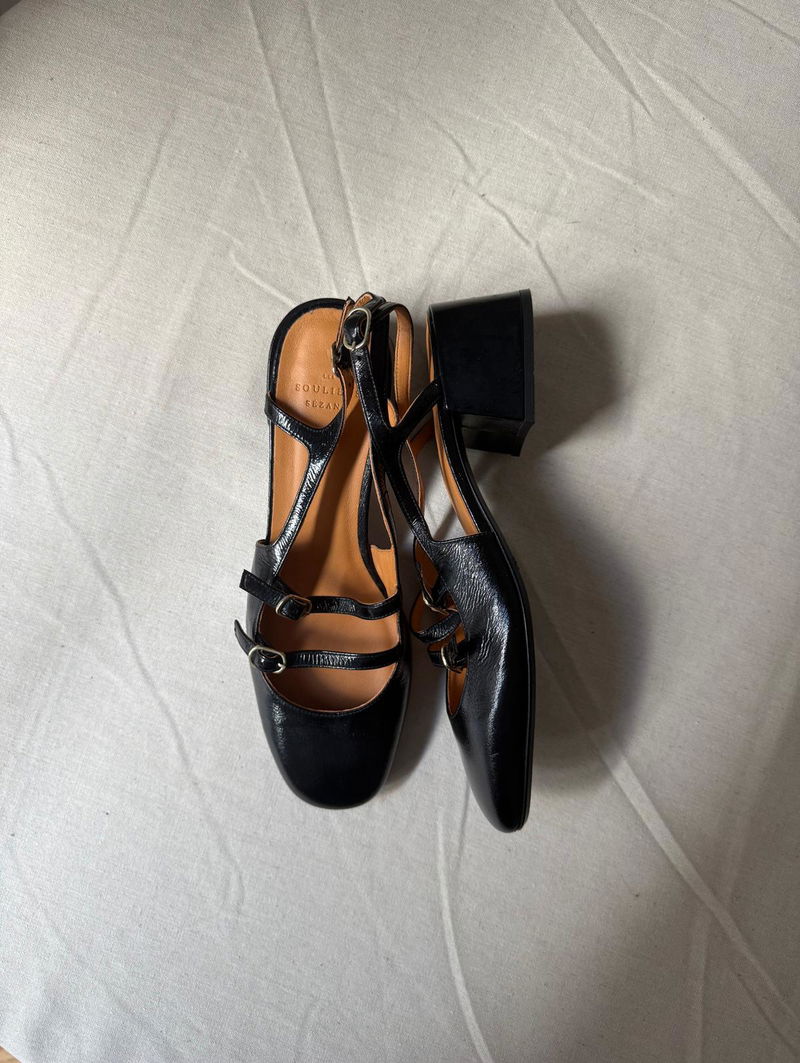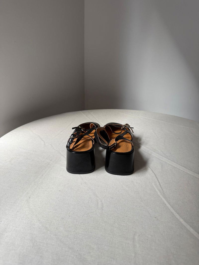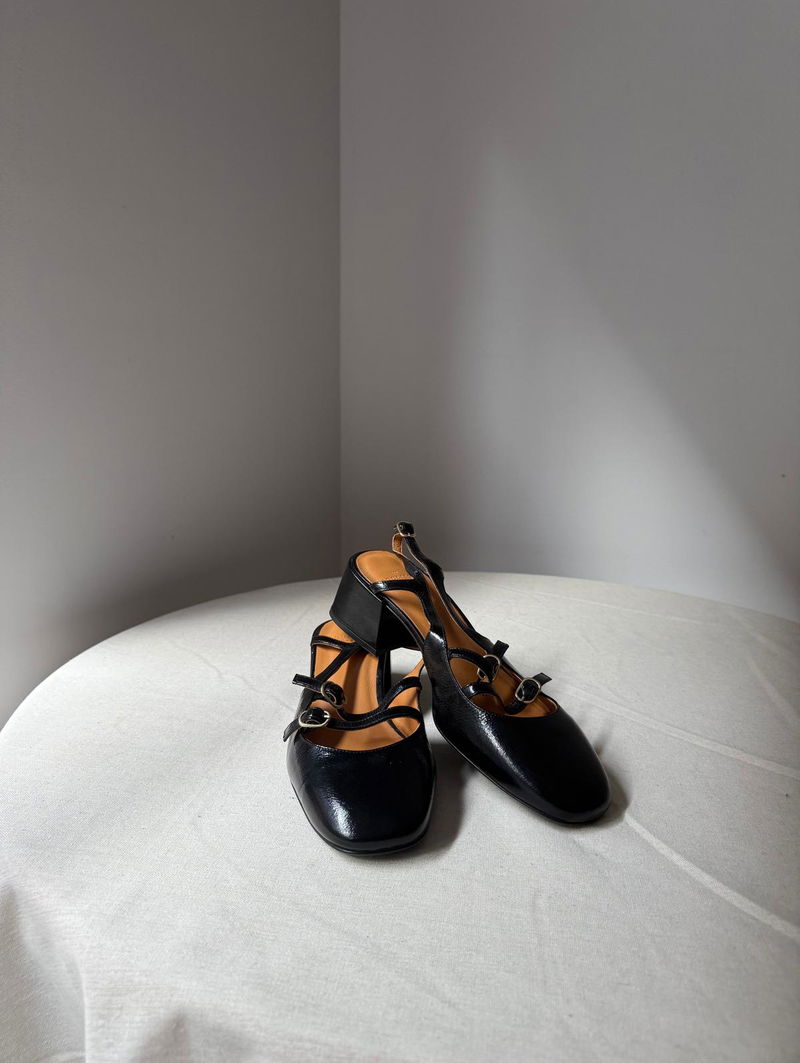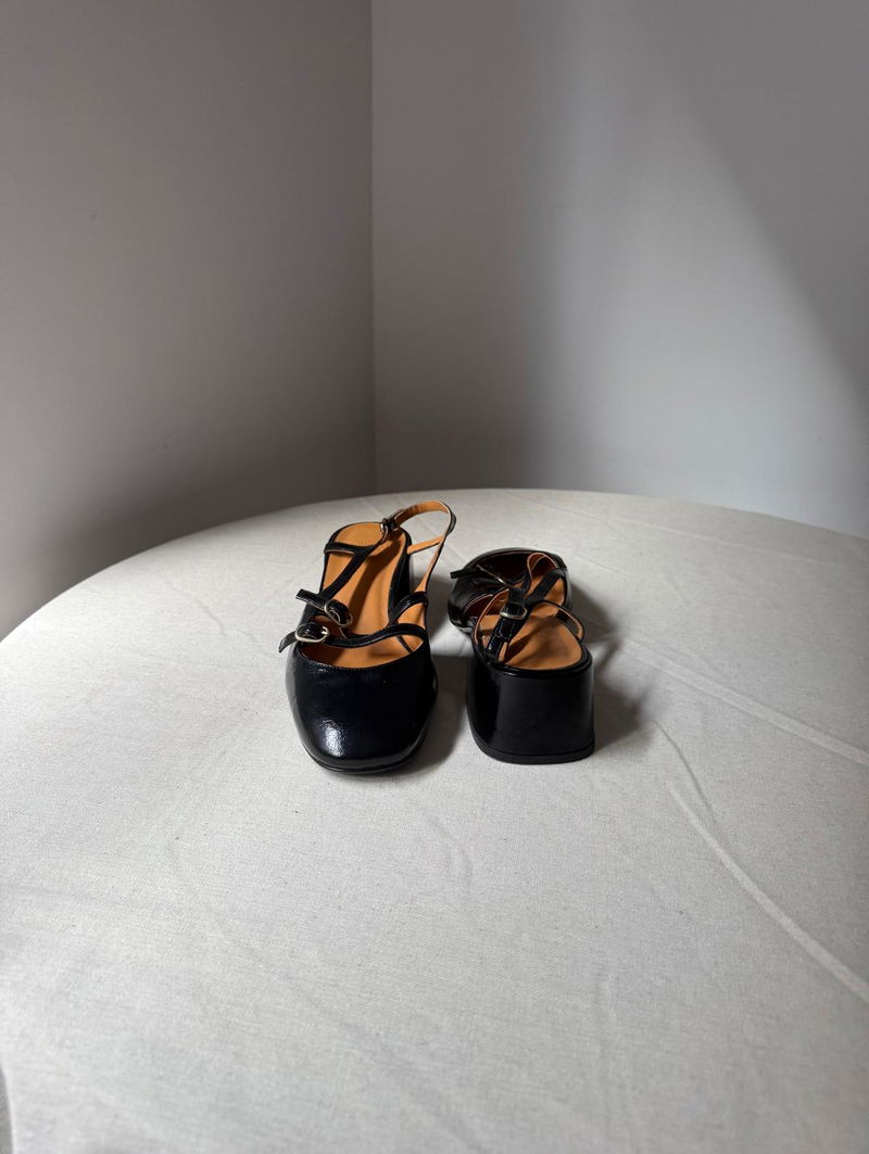 Mid-height heels. Buckled ankle strap fastening system. Patent leather exterior. Leather lining and insole.Rubber outsole. Patent leather covered heel.Heel height: 5 cm / 2 in. Light gold-finish brass buckle.